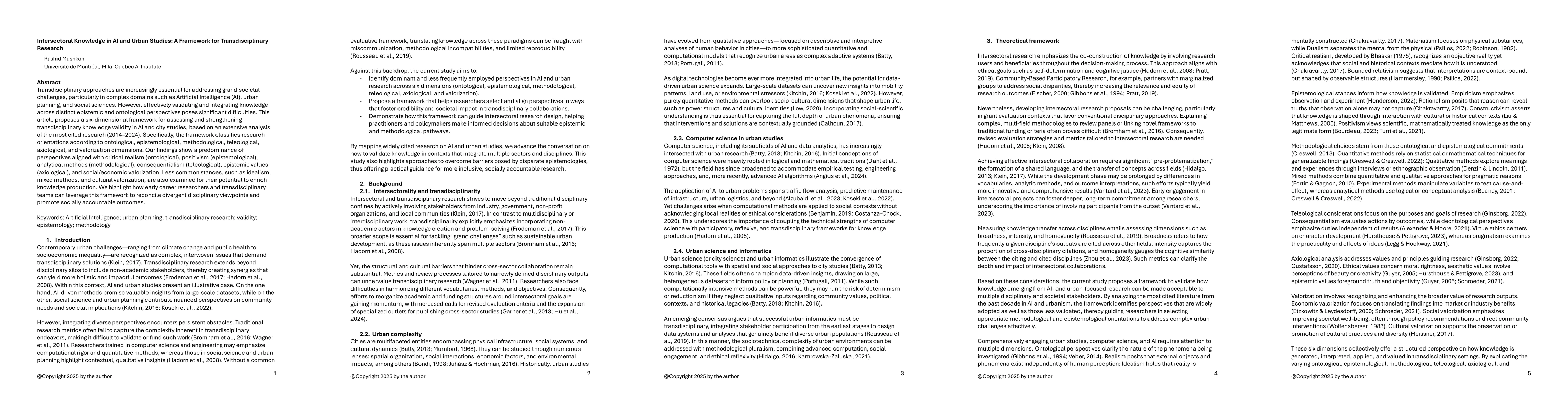 Proposing a six-dimensional framework for assessing transdisciplinary knowledge validity in AI and city studies.