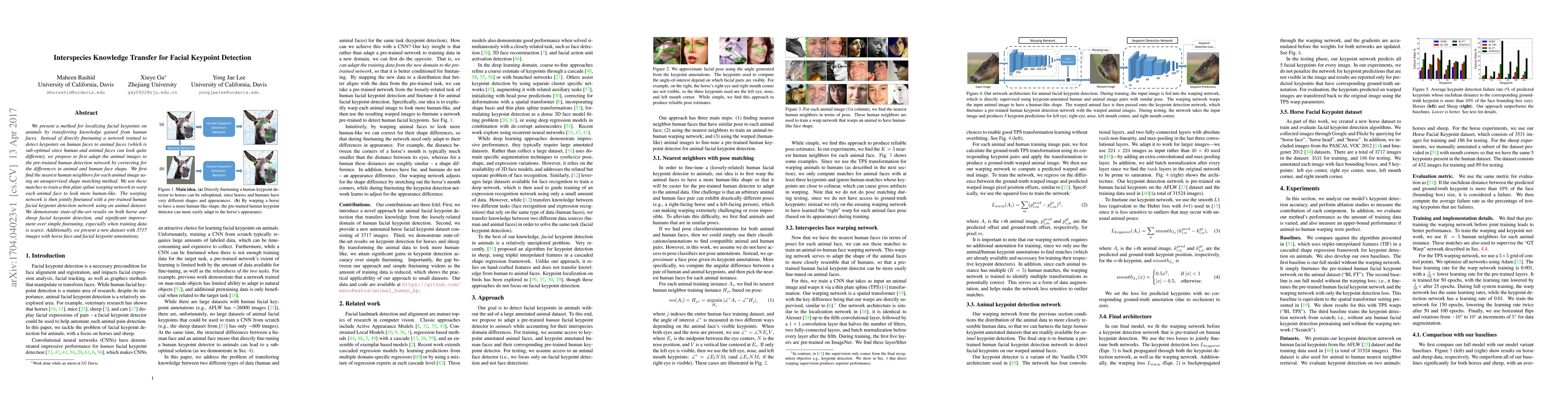 This paper presents a method for transferring knowledge from human to animal facial keypoint detection by warping animal faces to resemble human faces using a thin plate spline network, followed by joint finetuning with a pre-trained human detection network, achieving better results than direct finetuning, especially with limited training data. A new dataset with annotated horse faces is also introduced.