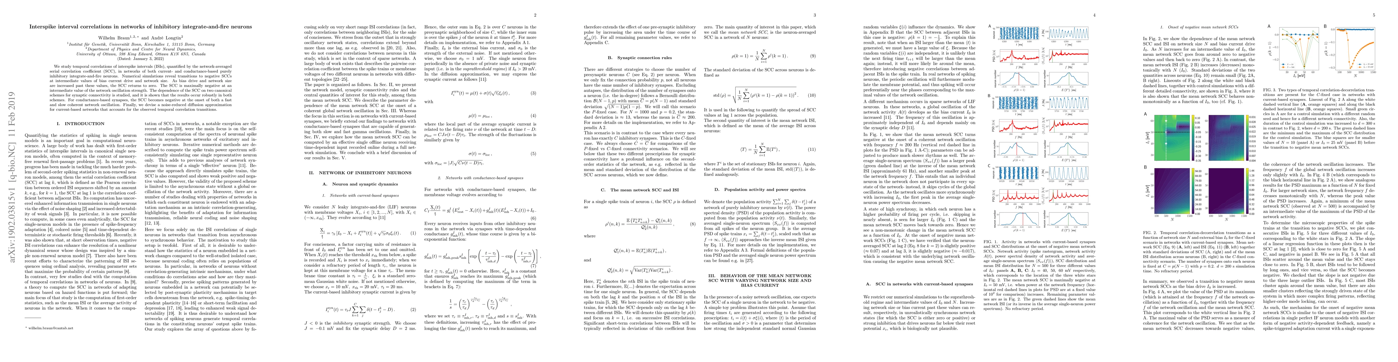 This paper investigates temporal correlations in interspike intervals of purely inhibitory integrate-and-fire neuron networks, revealing transitions to negative serial correlation coefficients at intermediate drive and size, which revert to zero with further increases. The study also shows robust negative SCCs under different synaptic connectivity schemes and proposes a noise-reduced diffusion approximation to model these transitions.