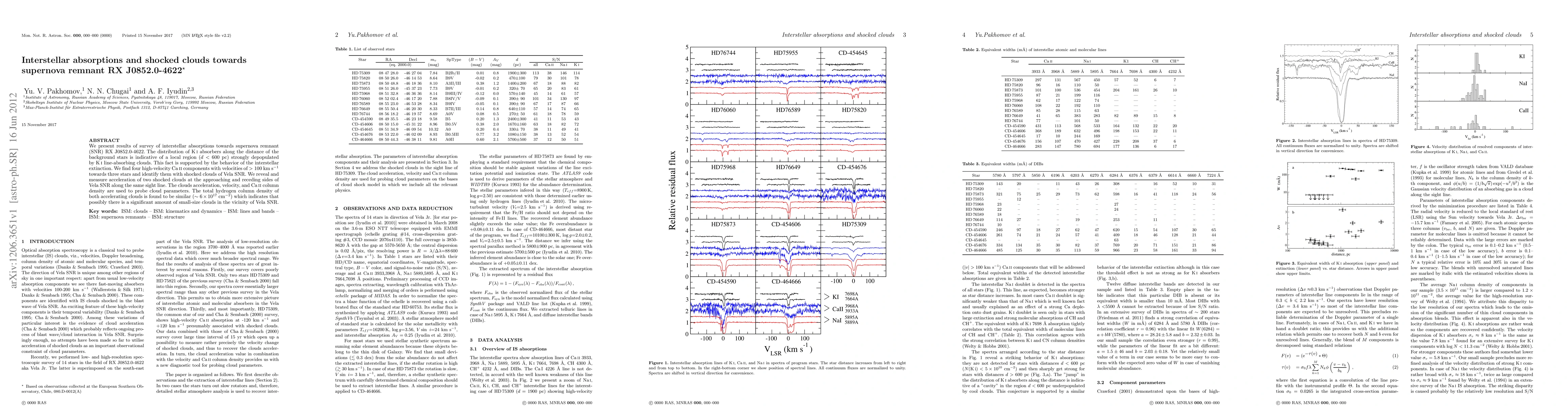 This study investigates interstellar absorptions towards the supernova remnant RX J0852.0-4622, revealing a local region depleted of KI line-absorbing clouds and identifying four high-velocity CaII components associated with shocked clouds from Vela SNR, indicating significant small-size clouds in the vicinity.