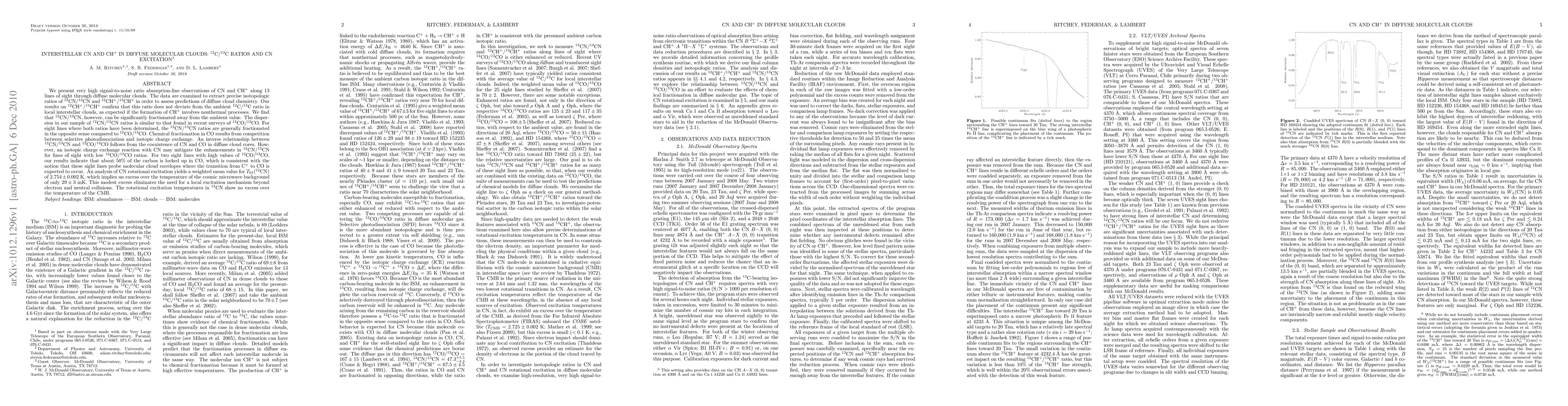 This paper reports high-resolution observations of CN and CH+ in diffuse molecular clouds, revealing precise isotopologic ratios of 12CN/13CN and 12CH+/13CH+. The study finds that while 12CH+/13CH+ ratios align with the ambient 12C/13C ratio, 12CN/13CN ratios can be significantly fractionated, indicating complex chemical processes in interstellar chemistry.