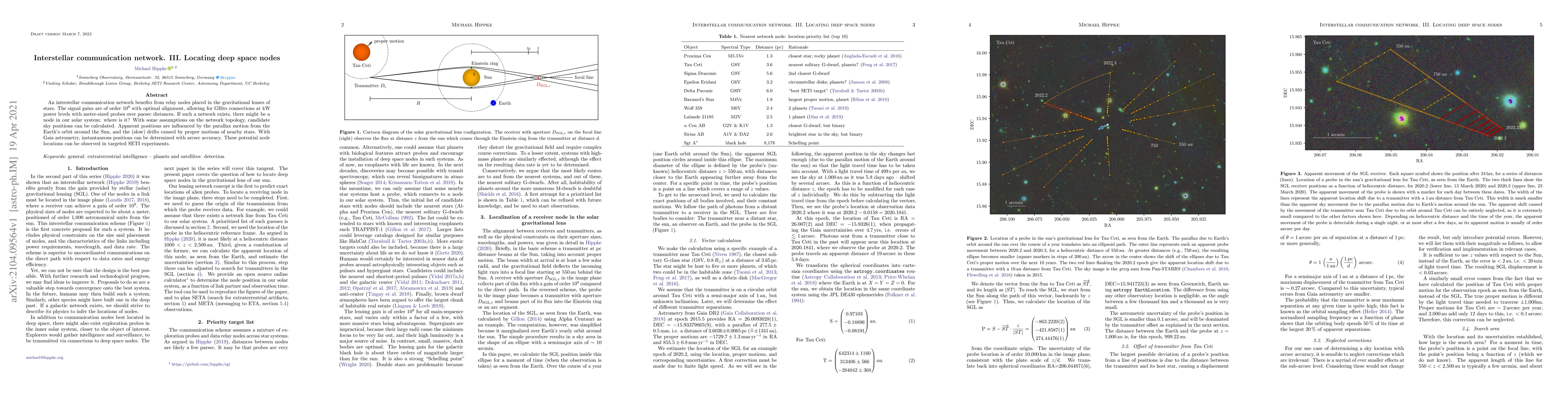 An interstellar communication network benefits from relay nodes placed in the gravitational lenses of stars. The signal gains are of order $10^{9}$ with optimal alignment, allowing for GBits connections at kW power levels with meter-sized probes over parsec distances. If such a network exists, there might be a node in our solar system: where is it? With some assumptions on the network topology, candidate sky positions can be calculated. Apparent positions are influenced by the parallax motion from the Earth's orbit around the Sun, and the (slow) drifts caused by proper motions of nearby stars. With Gaia astrometry, instantaneous positions can be determined with arcsec accuracy. These potential node locations can be observed in targeted