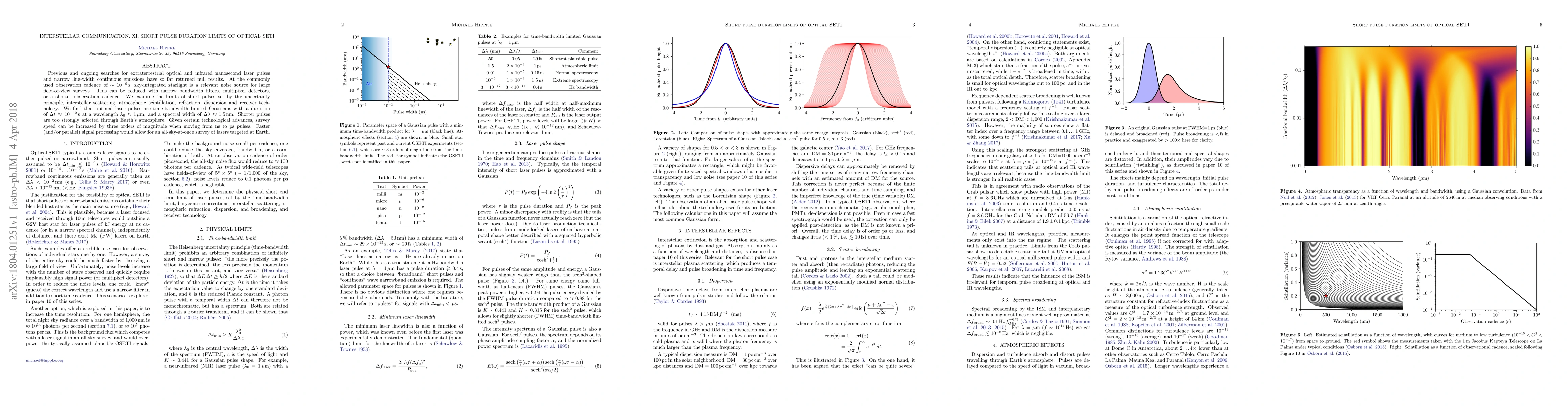 Previous and ongoing searches for extraterrestrial optical and infrared nanosecond laser pulses and narrow line-width continuous emissions have so far returned null results. At the commonly used observation cadence of $\sim 10^{-9}\,$s, sky-integrated starlight is a relevant noise source for large field-of-view surveys. This can be reduced with narrow bandwidth filters, multipixel detectors, or a shorter observation cadence. We examine the limits of short pulses set by the uncertainty principle, interstellar scattering, atmospheric scintillation, refraction, dispersion and receiver technology. We find that optimal laser pulses are time-bandwidth limited Gaussians with a duration of $\Delta t \approx\,10^{-12}\,$s at a wavelength $\lambda_{0}\approx1\,\mu$m, and a spectral width of $\Delta \lambda \approx 1.5\,$nm. Shorter pulses are too strongly affected through Earth's atmosphere. Given certain technological advances, survey speed can be increased by three orders of magnitude when moving from ns to ps pulses. Faster (and/or parallel) signal processing would allow for an all-sky-at-once survey of lasers targeted at Earth.