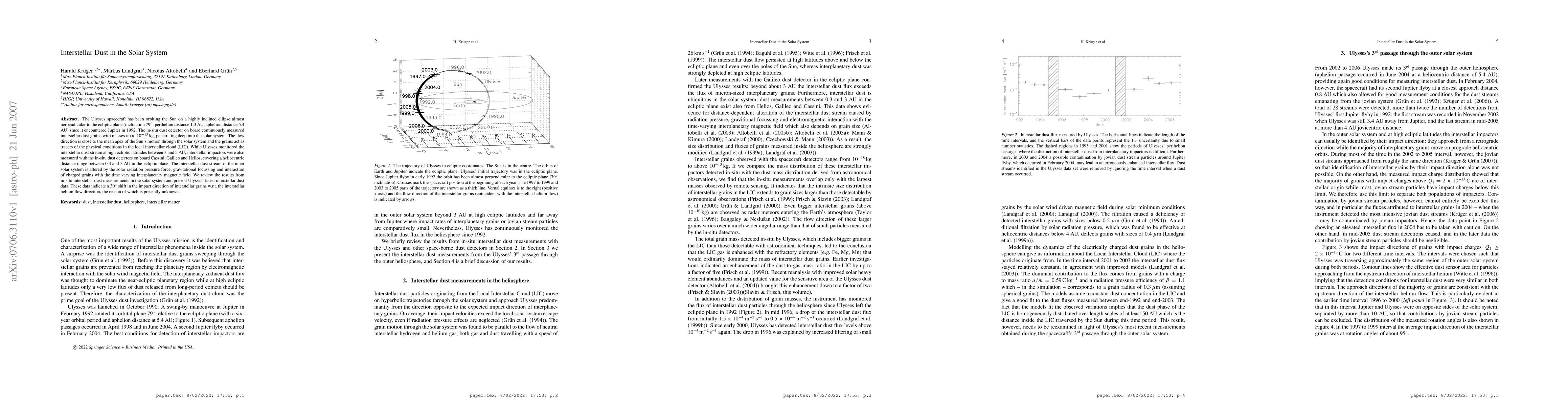 The Ulysses spacecraft has measured interstellar dust grains in the solar system, revealing a 30-degree shift in the impact direction of these grains compared to the interstellar helium flow, while the interstellar dust stream is influenced by solar radiation pressure and magnetic fields. Ulysses' latest data provide insights into the physical conditions in the local interstellar cloud.
