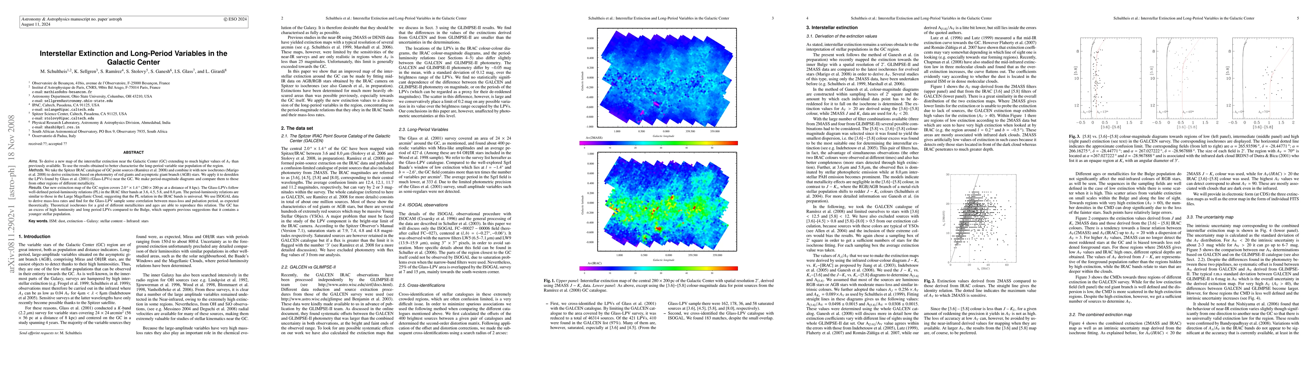 This paper presents an updated extinction map of the Galactic Center using Spitzer IRAC catalogue data and new isochrones, revealing higher extinction values than previously available. The map is applied to deredden long-period variable stars, showing period-luminosity relations consistent with those in the Large Magellanic Cloud, suggesting universality across different metallicities.