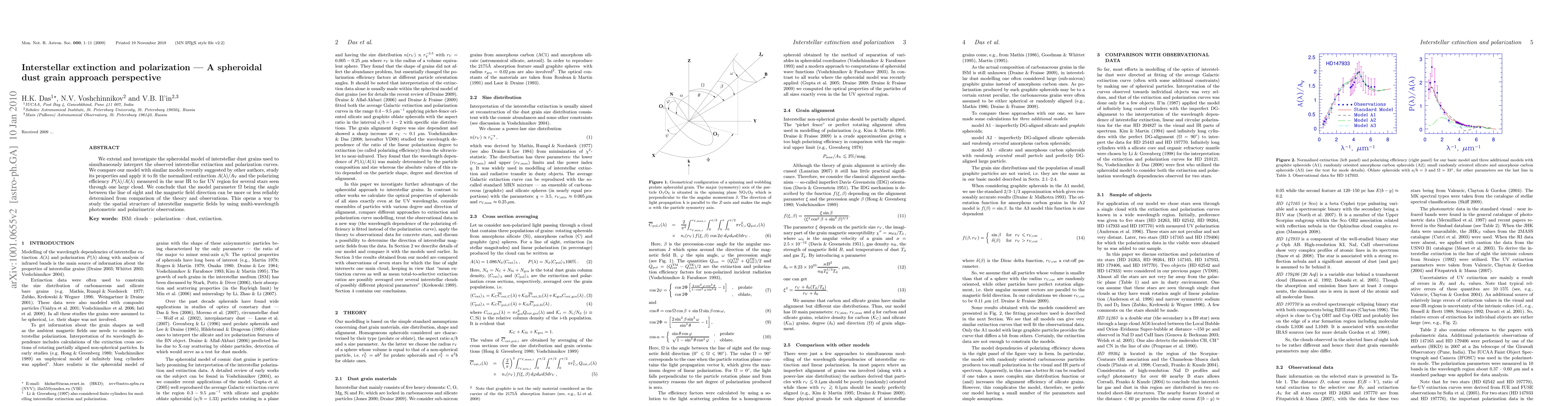 This paper investigates a spheroidal model of interstellar dust grains to interpret extinction and polarization, comparing it with other models and fitting it to observational data across the near IR to far UV spectrum. The study finds that the model parameter $\Omega$ can reliably determine the angle between the line of sight and the magnetic field, enabling the study of interstellar magnetic fields through multi-wavelength observations.