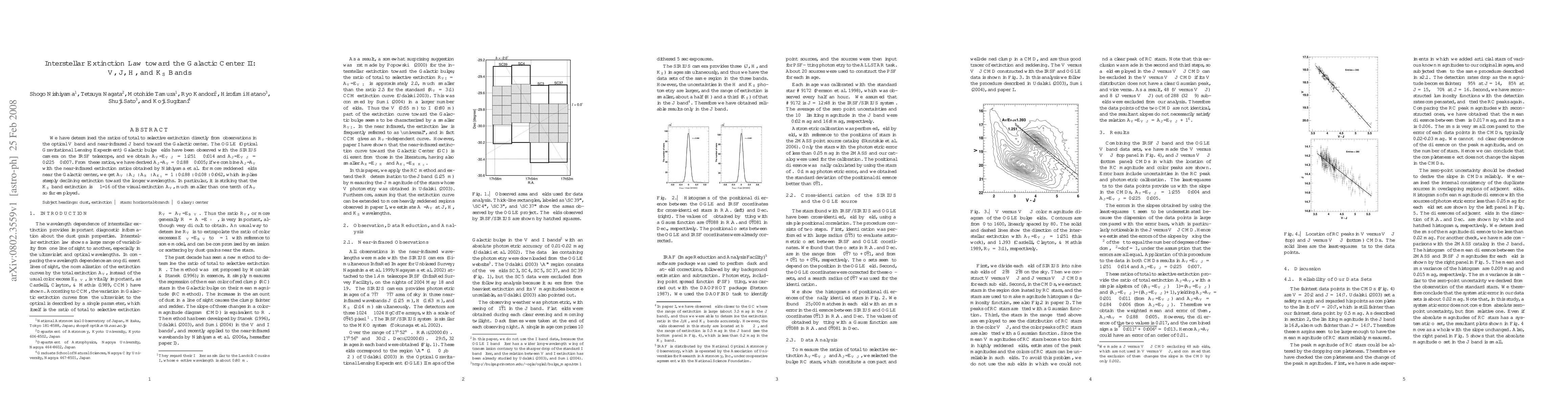 This paper determines the interstellar extinction law toward the Galactic center in the V, J, H, and Ks bands, finding a steeply declining extinction ratio with wavelength, particularly noting that Ks band extinction is about 1/16th of the visual extinction, significantly less than previously assumed.