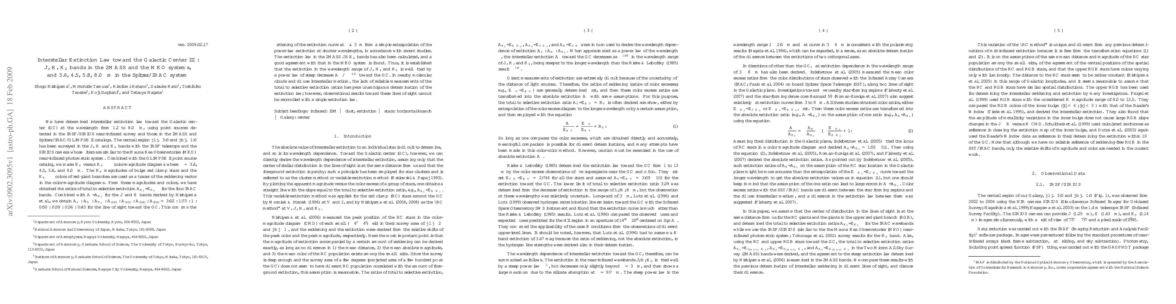 This paper determines the interstellar extinction law toward the Galactic Center in multiple infrared bands, confirming the flattening of the extinction curve at wavelengths greater than 3 microns. The study combines data from various surveys and catalogs to derive extinction ratios, showing good agreement between the 2MASS and MKO systems.