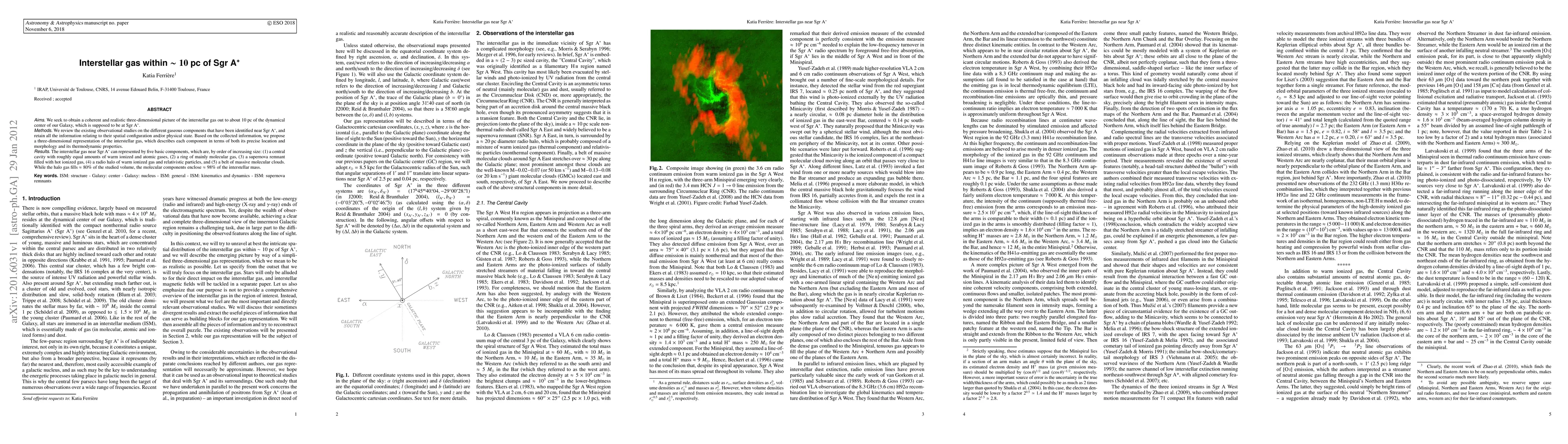 We seek to obtain a coherent and realistic three-dimensional picture of the interstellar gas out to about 10 pc of the dynamical center of our Galaxy, which is supposed to be at Sgr A$^*$. We review the existing observational studies on the different gaseous components that have been identified near Sgr A$^*$, and retain all the information relating to their spatial configuration and/or physical state. Based on the collected information, we propose a three-dimensional representation of the interstellar gas, which describes each component in terms of both its precise location and morphology and its thermodynamic properties. The interstellar gas near Sgr A$^*$ can represented by five basic components, which are, by order of increasing size: (1) a central cavity with roughly equal amounts of warm ionized and atomic gases, (2) a ring of mainly molecular gas, (3) a supernova remnant filled with hot ionized gas, (4) a radio halo of warm ionized gas and relativistic particles, and (5) a belt of massive molecular clouds. While the halo gas fills $\approx 80%$ of the studied volume, the molecular components enclose $\approx 98%$ of the interstellar mass.