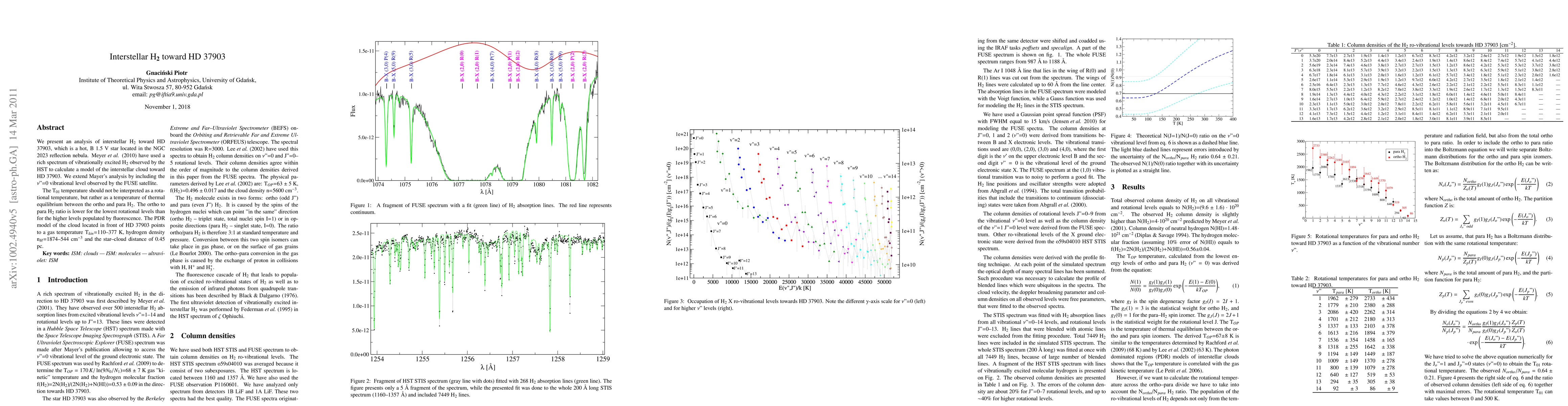 This research analyzes interstellar H2 toward HD 37903 in the NGC 2023 nebula, combining data from HST and FUSE to model the cloud. The derived temperature suggests thermal equilibrium between ortho and para H2, with a kinetic temperature of 110-377 K and hydrogen density of 1874-544 cm^-3.