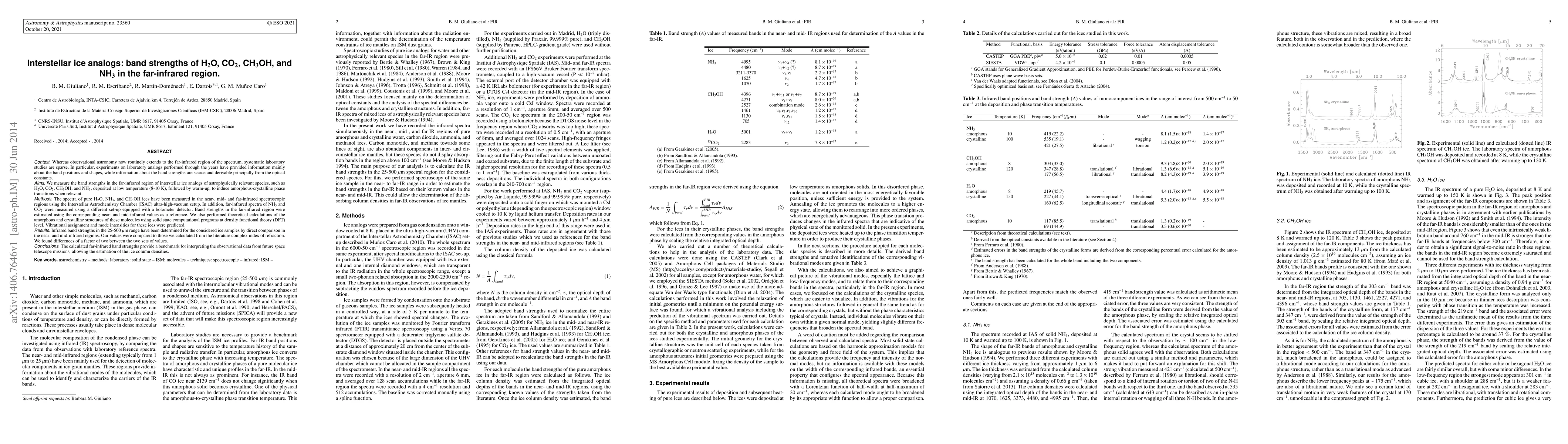 This paper measures and compares the far-infrared band strengths of interstellar ice analogs of H$_2$O, CO$_2$, CH$_3$OH, and NH$_3$, deposited at low temperatures and analyzed using various spectroscopic setups. The study provides a benchmark for interpreting future space telescope observations, revealing discrepancies between calculated and literature values by a factor of two.