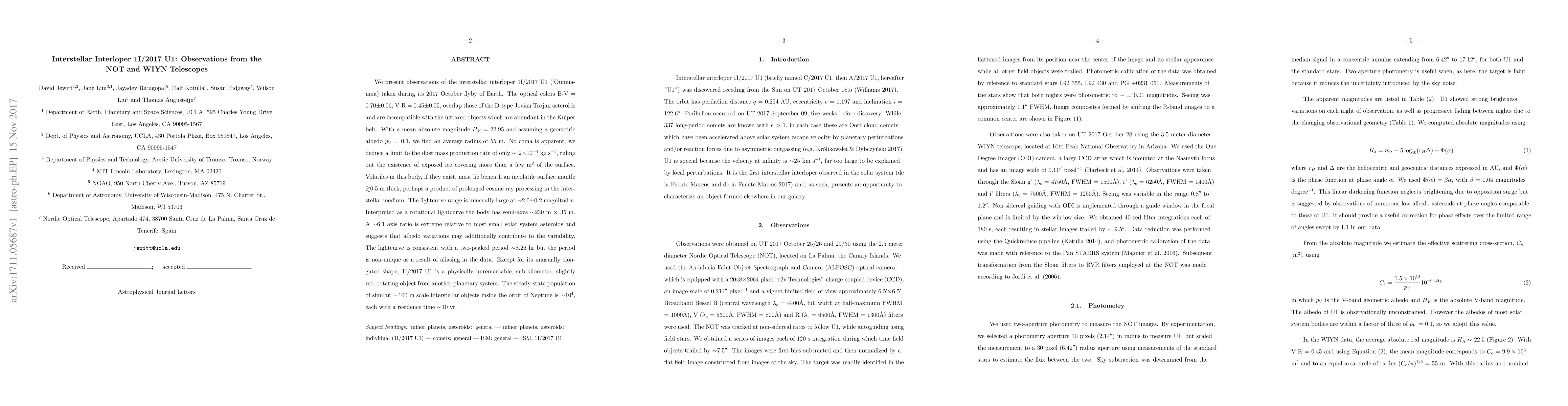 We present observations of the interstellar interloper 1I/2017 U1 ('Oumuamua) taken during its 2017 October flyby of Earth. The optical colors B-V = 0.70$\pm$0.06, V-R = 0.45$\pm$0.05, overlap those of the D-type Jovian Trojan asteroids and are incompatible with the ultrared objects which are abundant in the Kuiper belt. With a mean absolute magnitude $H_V$ = 22.95 and assuming a geometric albedo $p_V$ = 0.1, we find an average radius of 55 m. No coma is apparent; we deduce a limit to the dust mass production rate of only $\sim$ 2$\times$10$^{-4}$ kg s$^{-1}$, ruling out the existence of exposed ice covering more than a few m$^2$ of the surface. Volatiles in this body, if they exist, must lie beneath an involatile surface mantle $\gtrsim$0.5 m thick, perhaps a product of prolonged cosmic ray processing in the interstellar medium. The lightcurve range is unusually large at $\sim$2.0$\pm$0.2 magnitudes. Interpreted as a rotational lightcurve the body has semi-axes $\sim$230 m $\times$ 35 m. A $\sim$6:1 axis ratio is extreme relative to most small solar system asteroids and suggests that albedo variations may additionally contribute to the variability. The lightcurve is consistent with a two-peaked period $\sim$8.26 hr but the period is non-unique as a result of aliasing in the data. Except for its unusually elongated shape, 1I/2017 U1 is a physically unremarkable, sub-kilometer, slightly red, rotating object from another planetary system. The steady-state population of similar, $\sim$100 m scale interstellar objects inside the orbit of Neptune is $\sim$10$^4$, each with a residence time $\sim$10 yr.