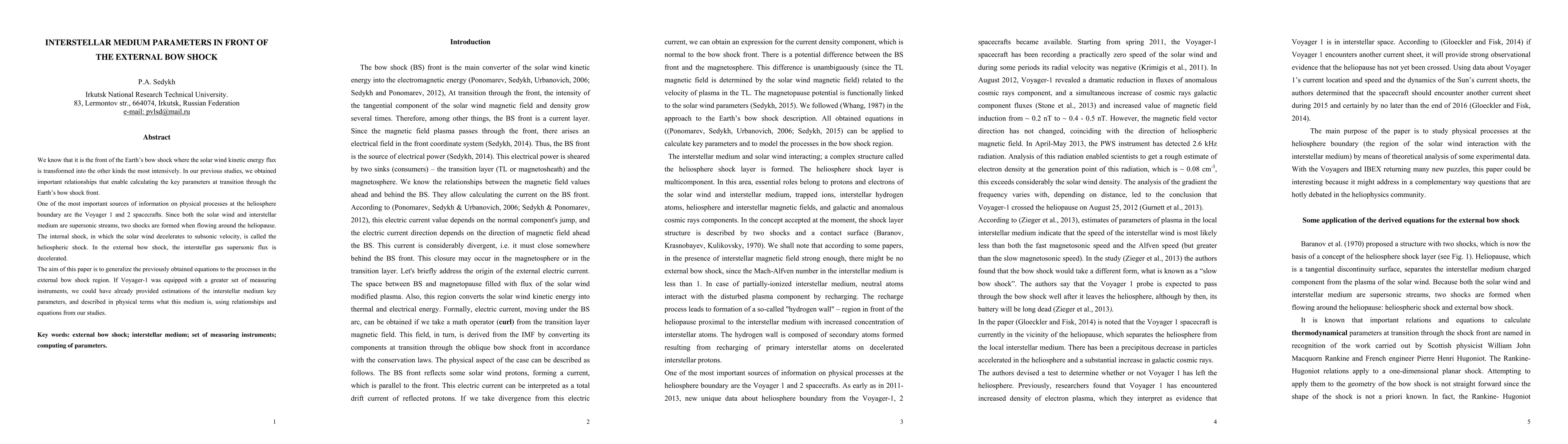 This paper generalizes previous equations to analyze the parameters of the interstellar medium in front of the external bow shock, where the solar wind's kinetic energy is transformed. The study aims to estimate key interstellar medium parameters using Voyager spacecraft data, highlighting the importance of the external bow shock in understanding heliosphere boundary processes.