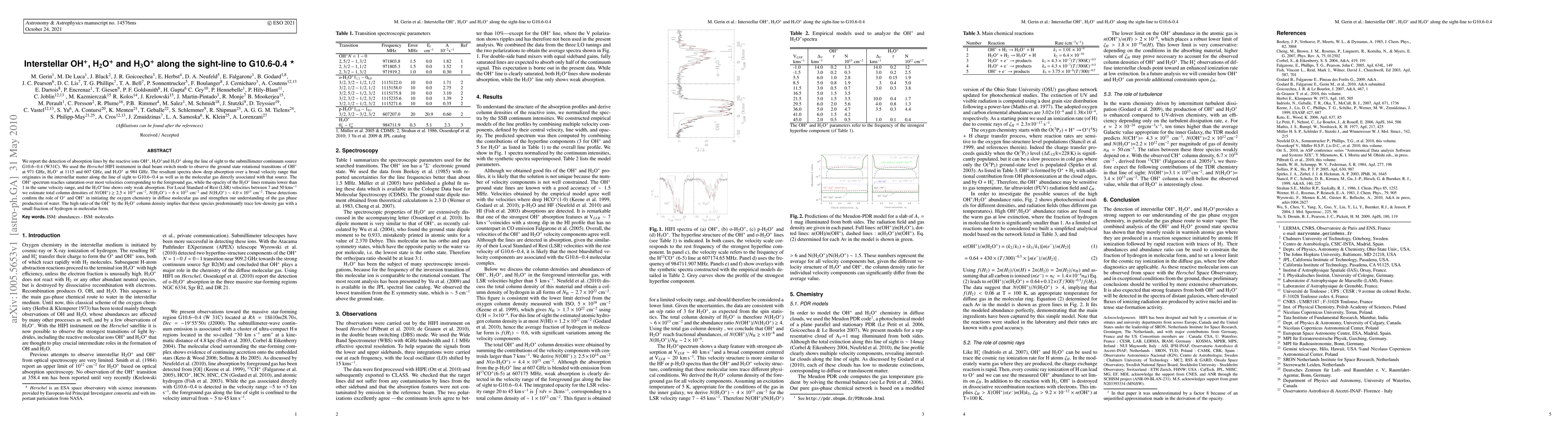This study detected absorption lines of OH+, H2O+, and H3O+ along the line of sight to G10.6-0.4 using the Herschel HIFI instrument, revealing significant column densities and indicating the role of O$^+$ and OH$^+$ in initiating oxygen chemistry in diffuse molecular gas. The findings suggest these ions predominantly trace low-density gas with limited molecular hydrogen.