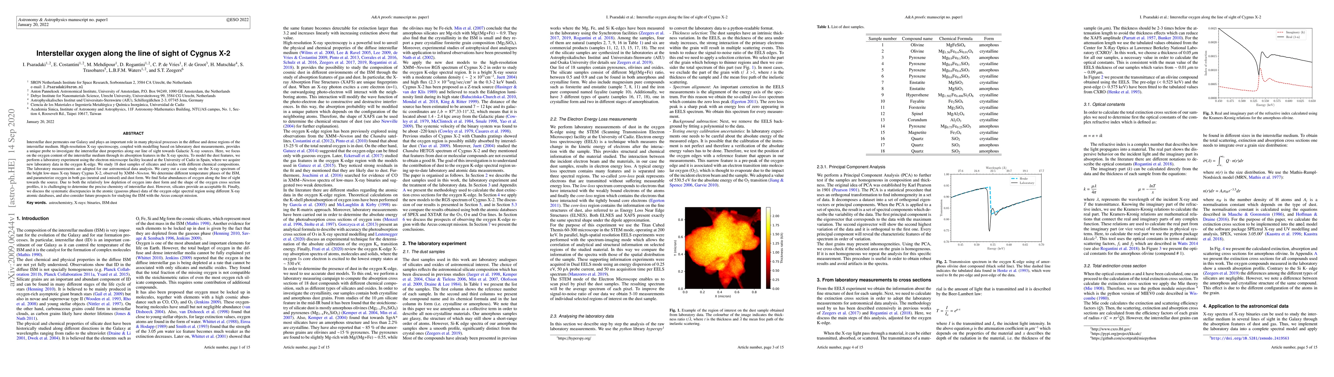 Interstellar dust permeates our Galaxy and plays an important role in many physical processes in the diffuse and dense regions of the interstellar medium. High-resolution X-ray spectroscopy, coupled with modelling based on laboratory dust measurements, provides a unique probe to investigate the interstellar dust properties along our line of sight towards Galactic X-ray sources. Here, we focus on the oxygen content of the interstellar medium through its absorption features in the X-ray spectra. To model the dust features, we perform a laboratory experiment using the electron microscope facility located at the University of Cadiz in Spain, where we acquire new laboratory data in the oxygen K-edge. We study 18 dust samples of silicates and oxides with different chemical compositions. The laboratory measurements are adopted for our astronomical data analysis. We carry out a case study on the X-ray spectrum of the bright low-mass X-ray binary Cygnus X-2, observed by XMM-Newton. We determine different temperature phases of the ISM, and parameterize oxygen in both gas (neutral and ionised) and dust form. We find Solar abundances of oxygen along the line of sight towards the source. Due to both the relatively low depletion of oxygen into dust form and the shape of the oxygen cross section profiles, it is challenging to determine the precise chemistry of interstellar dust. However, silicates provide an acceptable fit. Finally, we discuss the systematic discrepancies in the atomic (gaseous phase) data of the oxygen edge spectral region using different X-ray atomic databases, and also consider future prospects for studying the ISM with the Arcus concept mission.