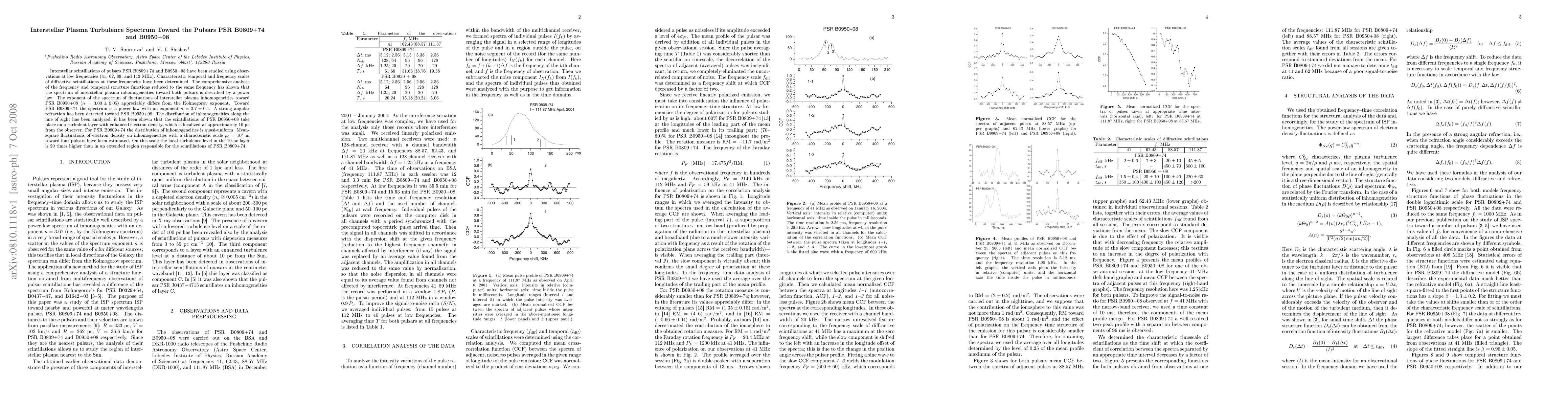 This study analyzes interstellar plasma turbulence toward pulsars PSR B0809+74 and B0950+08 using low-frequency observations, revealing distinct power-law spectra with different exponents. PSR B0950+08 exhibits strong angular refraction and localized turbulence near 10 pc, while PSR B0809+74 shows quasi-uniform inhomogeneity distribution.