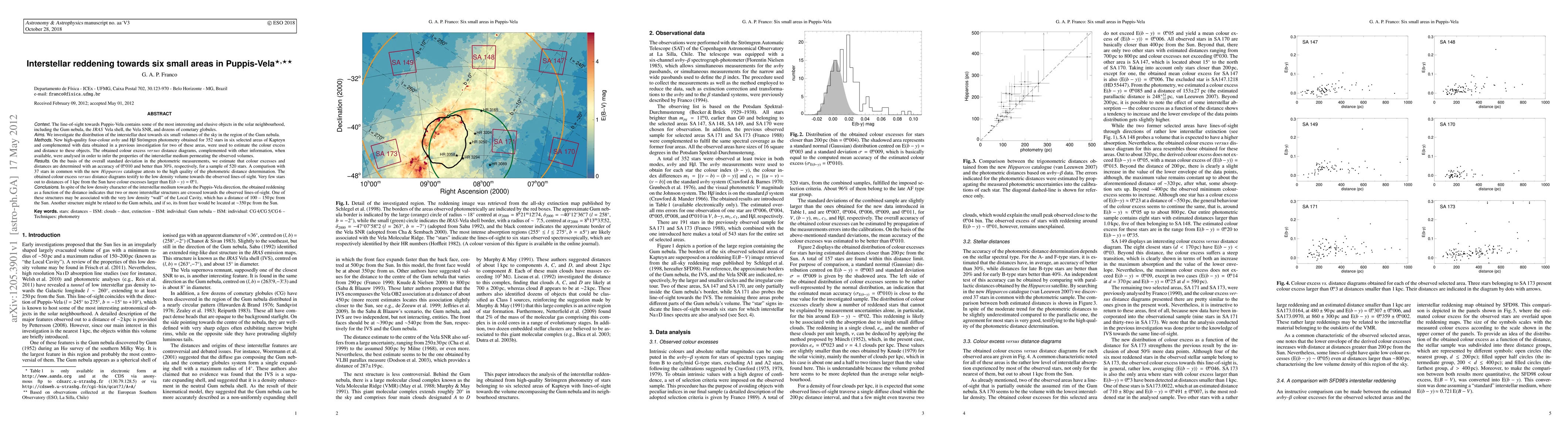 We investigate the distribution of the interstellar dust towards six small volumes of the sky in the region of the Gum nebula. New high-quality four-colour uvby and H\beta\ Str\"omgren photometry obtained for 352 stars in six selected areas of Kapteyn, complemented with data obtained in a previous investigation for two of these areas, were used to estimate the colour excess and distance to these objects. The obtained colour excess versus distance diagrams, complemented with other information, when available, were analysed in order to infer the properties of the interstellar medium permeating the observed volumes. On the basis of the overall standard deviation in the photometric measurements, we estimate that colour excesses and distances are determined with an accuracy of 0.010 mag and better than 30%, respectively, for a sample of 520 stars. A comparison with 37 stars in common with the new Hipparcos catalogue attests to the high quality of the photometric distance determination. The obtained colour excess versus distance diagrams testify to the low density volume towards the observed lines-of-sight. Very few stars out to distances of 1 kpc from the Sun have colour excesses larger than E(b-y) = 0.1 mag. In spite of the low density character of the interstellar medium towards the Puppis-Vela direction, the obtained reddening as a function of the distance indicates that two or more interstellar structures are crossed towards the observed lines-of-sight. One of these structures may be associated with the very low density wall of the Local Cavity, which has a distance of 100-150 pc from the Sun. Another structure might be related to the Gum nebula, and if so, its front face would be located at about 350 pc from the Sun.