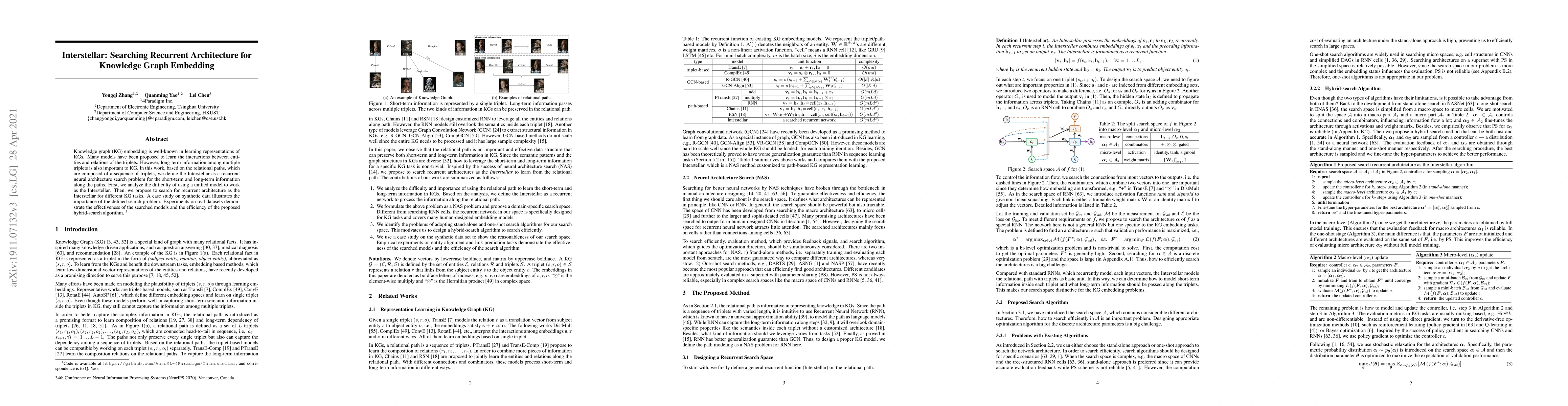 The paper proposes Interstellar, a neural architecture search (NAS) method for recurrent neural networks (RNNs) to learn from relational paths in knowledge graphs (KGs), which contain short-term and long-term information. It designs a specific search space based on important properties in relational paths and introduces a hybrid search algorithm that is more efficient than other state-of-the-art NAS algorithms.
