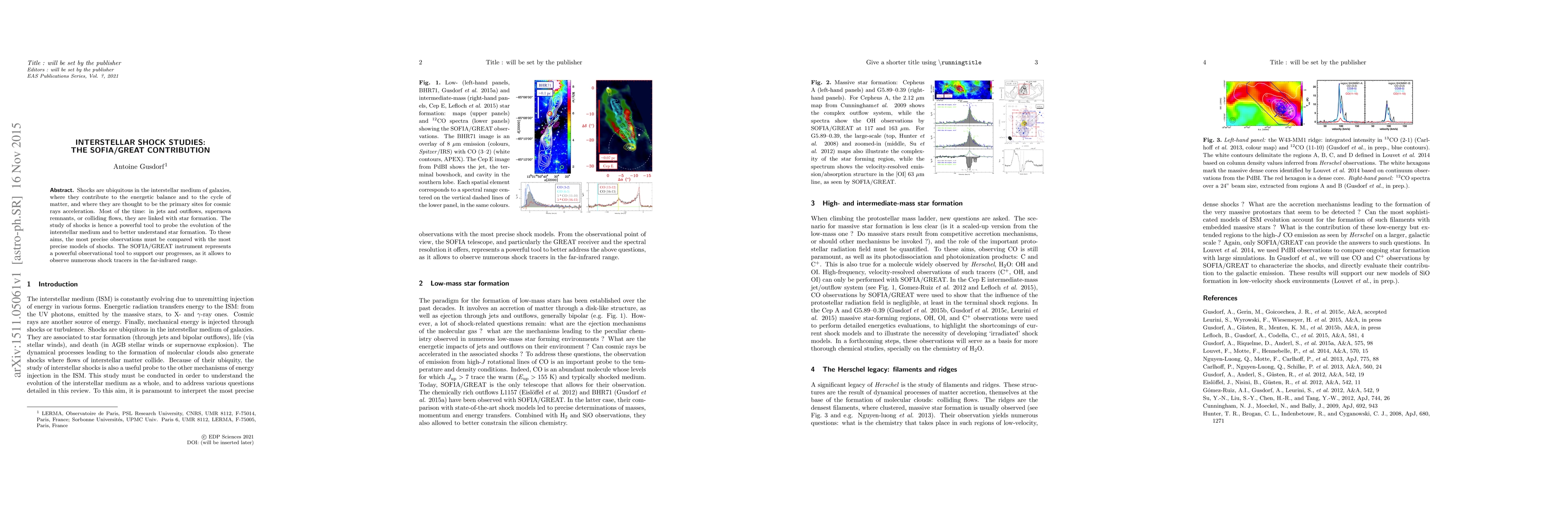 Shocks are ubiquitous in the interstellar medium of galaxies, where they contribute to the energetic balance and to the cycle of matter, and where they are thought to be the primary sites for cosmic rays acceleration. Most of the time: in jets and outflows, supernova remnants, or colliding flows, they are linked with star formation. The study of shocks is hence a powerful tool to probe the evolution of the interstellar medium and to better understand star formation. To these aims, the most precise observations must be compared with the most precise models of shocks. The SOFIA/GREAT instrument represents a powerful observational tool to support our progresses, as it allows to observe numerous shock tracers in the far-infrared range.