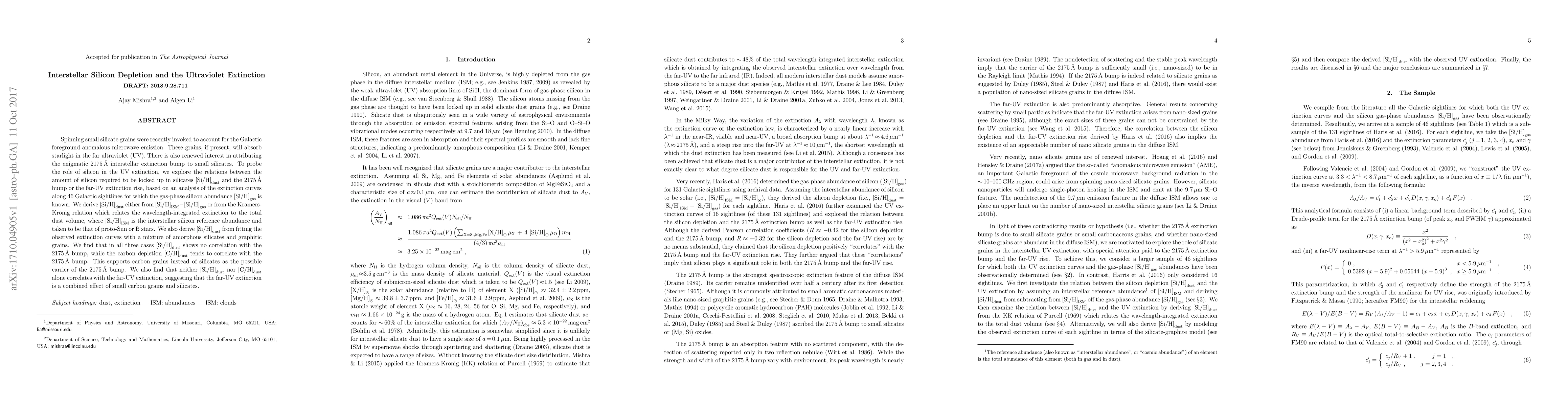 This research investigates the relationship between silicon depletion in interstellar silicates and the 2175 Angstrom extinction bump, finding no correlation between silicon and the bump, suggesting carbon grains may be responsible. It also concludes that the far-UV extinction is influenced by both carbon and silicate grains.