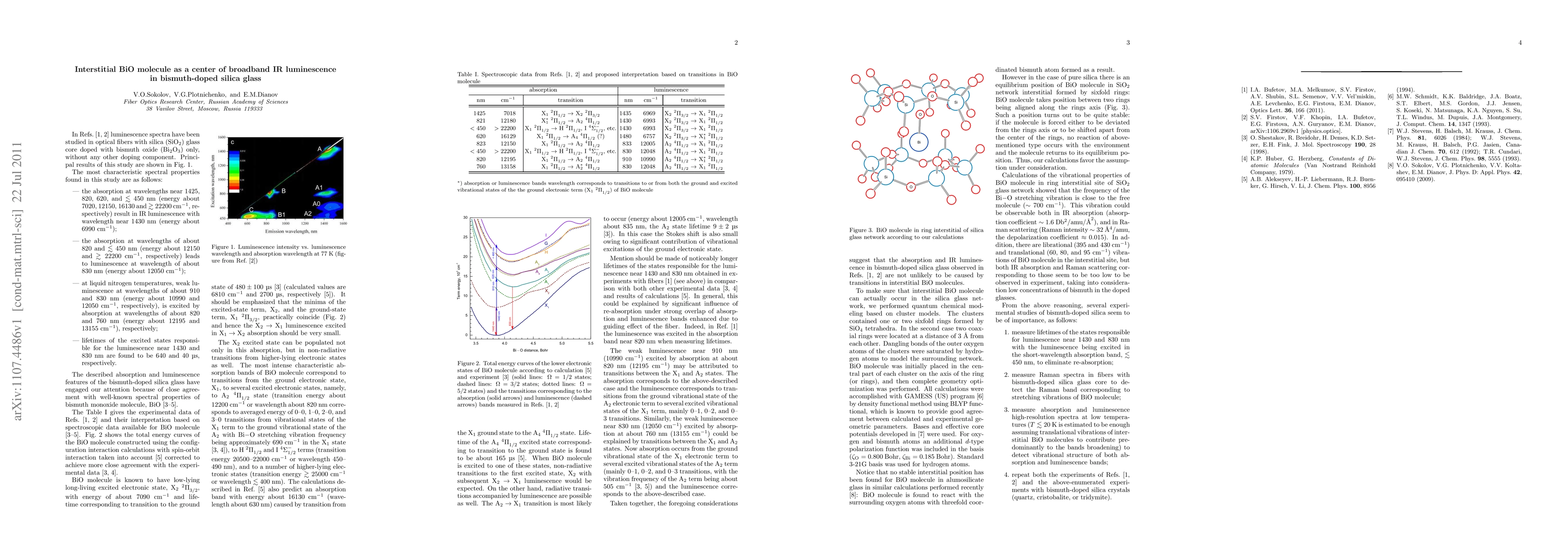 Summary: This study identifies interstitial BiO molecules as the source of broadband IR luminescence in bismuth-doped silica glass, attributing recent observed IR luminescence and absorption to transitions within these molecules.