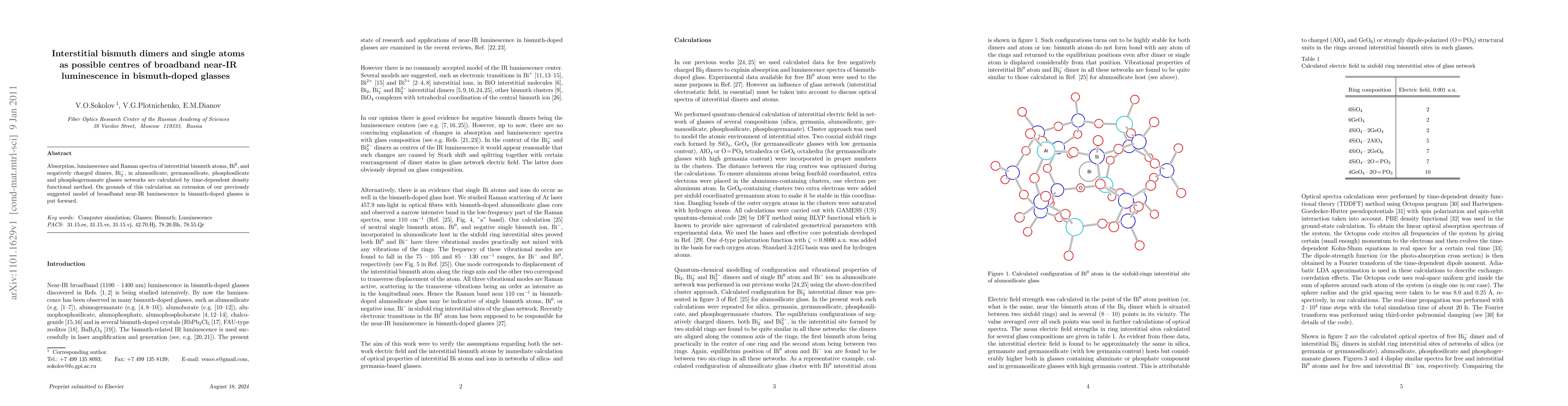 This paper investigates the broadband near-IR luminescence in bismuth-doped glasses using time-dependent density functional theory, focusing on interstitial bismuth atoms and negatively charged dimers, proposing an extended model for the observed luminescence.