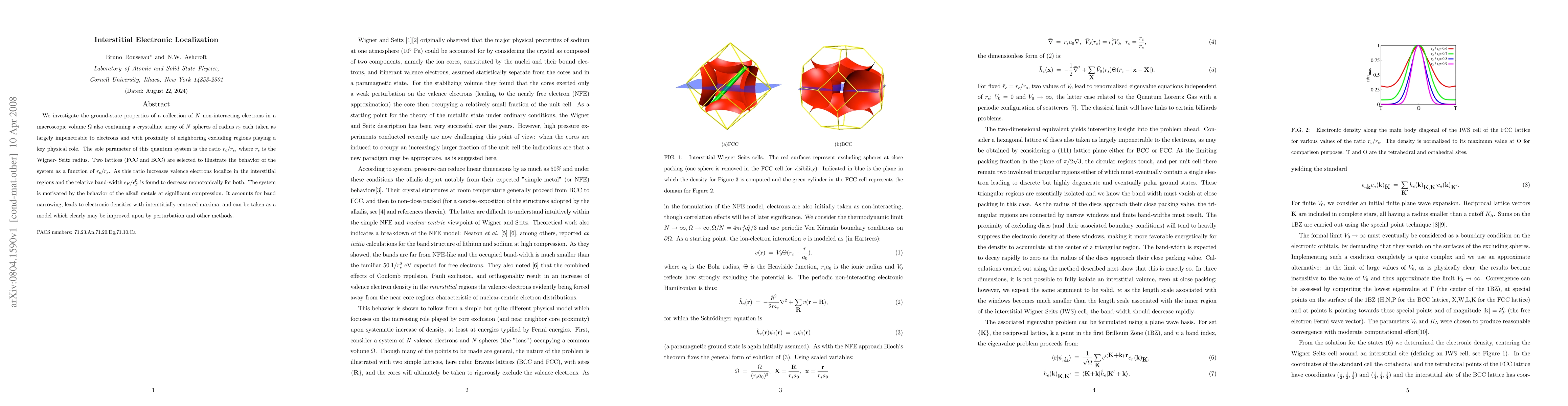 We investigate the ground-state properties of a collection of \textit{N} non-interacting electrons in a macroscopic volume $\Omega$ also containing a crystalline array of \textit{N} spheres of radius $r_c$ each taken as largely impenetrable to electrons and with proximity of neighboring excluding regions playing a key physical role. The sole parameter of this quantum system is the ratio $r_c/r_s$, where $r_s$ is the Wigner- Seitz radius. Two lattices (FCC and BCC) are selected to illustrate the behavior of the system as a function of $r_c/r_s$. As this ratio increases valence electrons localize in the interstitial regions and the relative band-width $\epsilon_F/\epsilon_F^0$ is found to decrease monotonically for both. The system is motivated by the behavior of the alkali metals at significant compression. It accounts for band narrowing, leads to electronic densities with interstitially centered maxima, and can be taken as a model which clearly may be improved upon by perturbation and other methods.