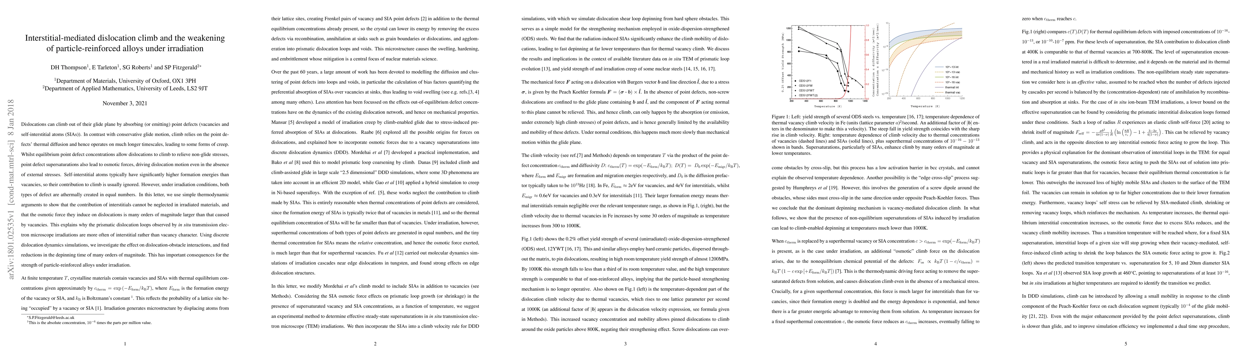 This paper demonstrates that self-interstitial atoms play a crucial role in dislocation climb and creep in particle-reinforced alloys under irradiation, leading to significant reductions in depinning time and weakening of the material. The study highlights the much larger osmotic force exerted by interstitials compared to vacancies, explaining the prevalence of interstitial-character prismatic loops.