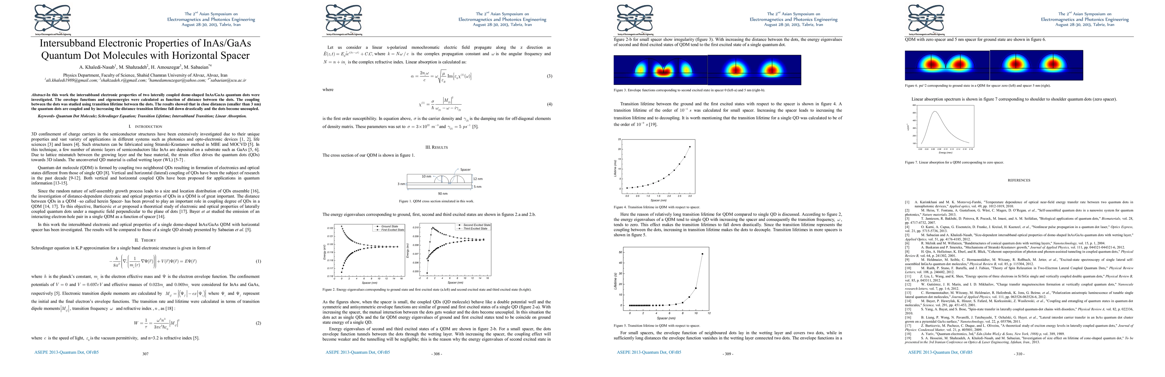 In this work the intersubband electronic properties of two laterally coupled dome-shaped InAs/GaAs quantum dots were investigated. The envelope functions and eigenenergies were calculated as function of distance between the dots. The coupling between the dots was studied using transition lifetime between the dots. The results showed that in close distances (smaller than 3 nm) the quantum dots are coupled and by increasing the distance transition lifetime fall down drastically and the dots become uncoupled.