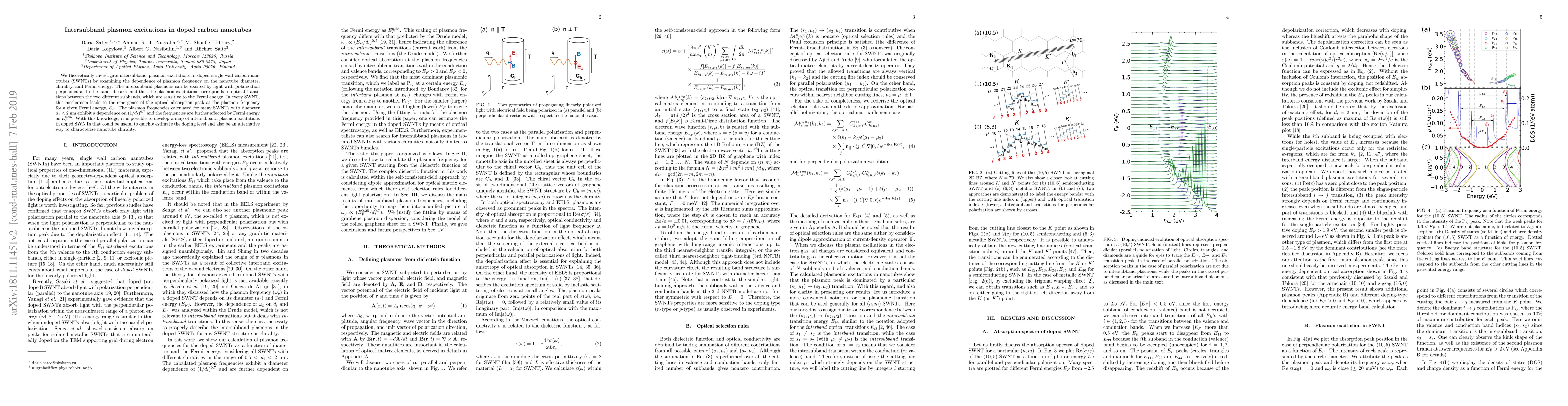 We theoretically investigate intersubband plasmon excitations in doped single wall carbon nanotubes (SWNTs) by examining the dependence of plasmon frequency on the nanotube diameter, chirality, and Fermi energy. The intersubband plasmons can be excited by light with polarization perpendicular to the nanotube axis and thus the plasmon excitations corresponds to optical transitions between the two different subbands, which are sensitive to the Fermi energy. In every SWNT, this mechanism leads to the emergence of the optical absorption peak at the plasmon frequency for a given Fermi energy, $E_F$. The plasmon frequencies calculated for many SWNTs with diameter $d_t < 2$ nm exhibit a dependence on $(1/d_t)^{0.7}$ and the frequencies are further affected by Fermi energy as $E_F^{0.25}$. With this knowledge, it is possible to develop a map of intersubband plasmon excitations in doped SWNTs that could be useful to quickly estimate the doping level and also be an alternative way to characterize nanotube chirality.