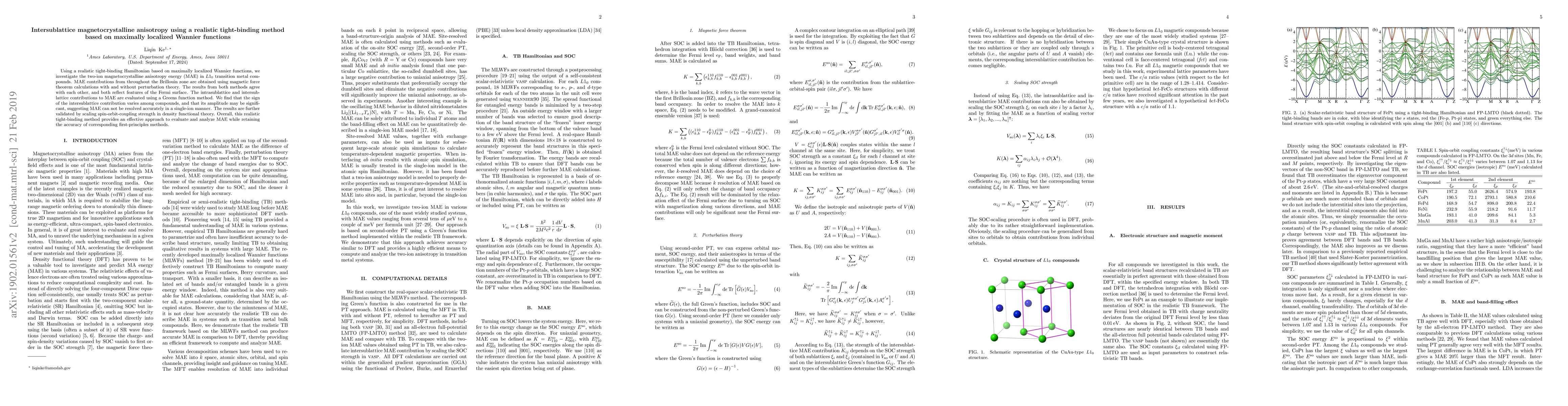Using a realistic tight-binding Hamiltonian based on maximally localized Wannier functions, we investigate the two-ion magnetocrystalline anisotropy energy (MAE) in $L1_0$ transition metal compounds. MAE contributions from throughout the Brillouin zone are obtained using magnetic force theorem calculations with and without perturbation theory. The results from either method agree with one another, and both reflect features of the Fermi surface. The intra-sublattice and inter-sublattice contributions to MAE are evaluated using a Green's function method. We find that the sign of the inter-sublattice contribution varies among compounds, and that its amplitude may be significant, suggesting MAE can not be resolved accurately in a single-ion manner. The results are further validated by scaling spin-orbit-coupling strength in density functional theory. Overall, this realistic tight-binding method provide an effective approach to evaluate and analyze MAE while retaining the accuracy of corresponding first-principles methods.