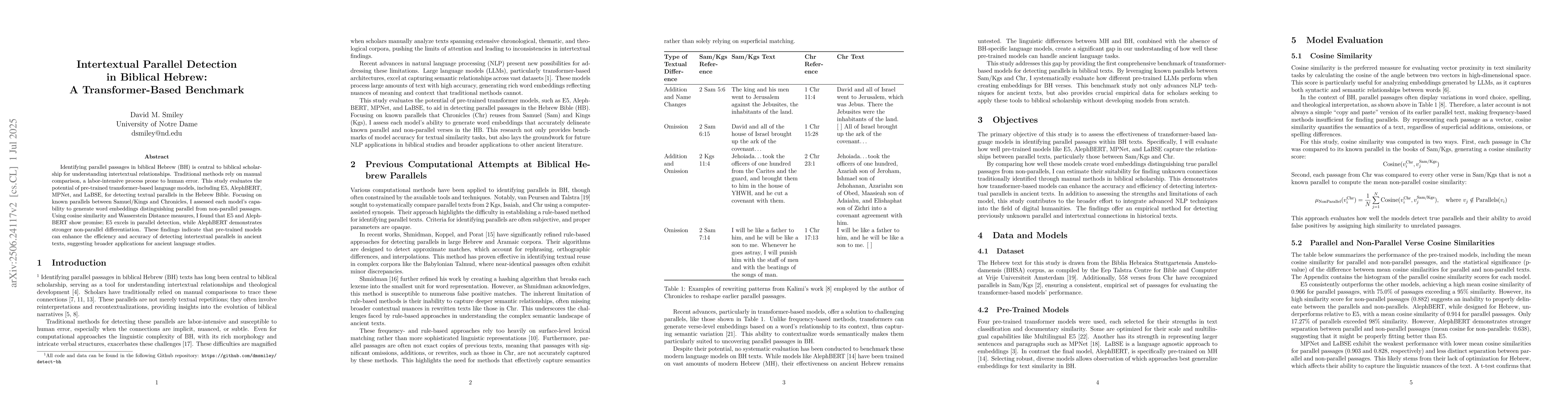 Identifying parallel passages in biblical Hebrew (BH) is central to biblical scholarship for understanding intertextual relationships. Traditional methods rely on manual comparison, a labor-intensive process prone to human error. This study evaluates the potential of pre-trained transformer-based language models, including E5, AlephBERT, MPNet, and LaBSE, for detecting textual parallels in the Hebrew Bible. Focusing on known parallels between Samuel/Kings and Chronicles, I assessed each model's capability to generate word embeddings distinguishing parallel from non-parallel passages. Using cosine similarity and Wasserstein Distance measures, I found that E5 and AlephBERT show promise; E5 excels in parallel detection, while AlephBERT demonstrates stronger non-parallel differentiation. These findings indicate that pre-trained models can enhance the efficiency and accuracy of detecting intertextual parallels in ancient texts, suggesting broader applications for ancient language studies.