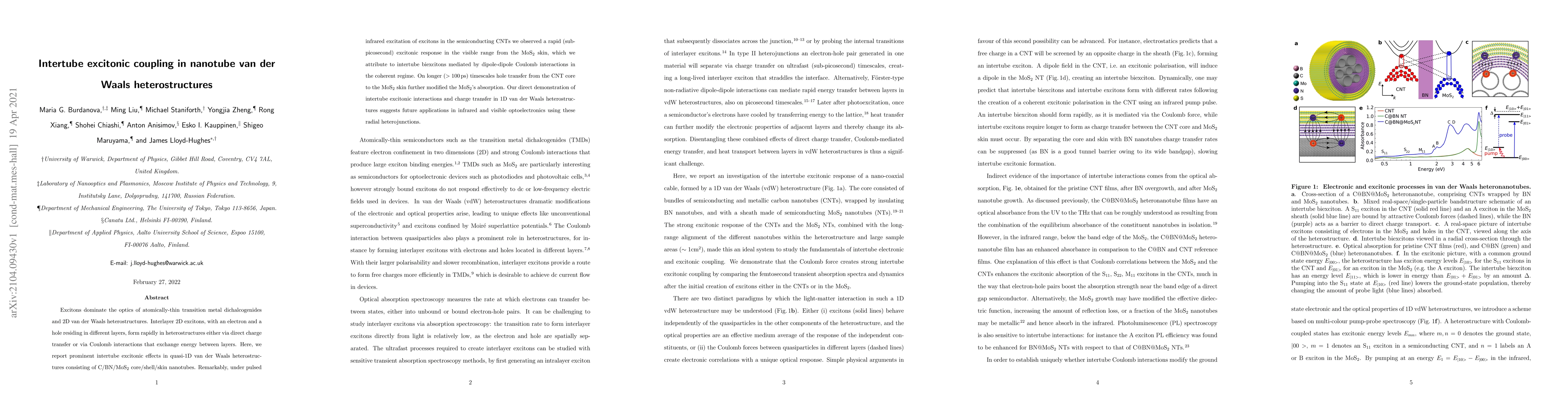 Excitons dominate the optics of atomically-thin transition metal dichalcogenides and 2D van der Waals heterostructures. Interlayer 2D excitons, with an electron and a hole residing in different layers, form rapidly in heterostructures either via direct charge transfer or via Coulomb interactions that exchange energy between layers. Here, we report prominent intertube excitonic effects in quasi-1D van der Waals heterostructures consisting of C/BN/MoS$_2$ core/shell/skin nanotubes. Remarkably, under pulsed infrared excitation of excitons in the semiconducting CNTs we observed a rapid (sub-picosecond) excitonic response in the visible range from the MoS$_2$ skin, which we attribute to intertube biexcitons mediated by dipole-dipole Coulomb interactions in the coherent regime. On longer ($>100$ps) timescales hole transfer from the CNT core to the MoS$_2$ skin further modified the MoS$_2$'s absorption. Our direct demonstration of intertube excitonic interactions and charge transfer in 1D van der Waals heterostructures suggests future applications in infrared and visible optoelectronics using these radial heterojunctions.