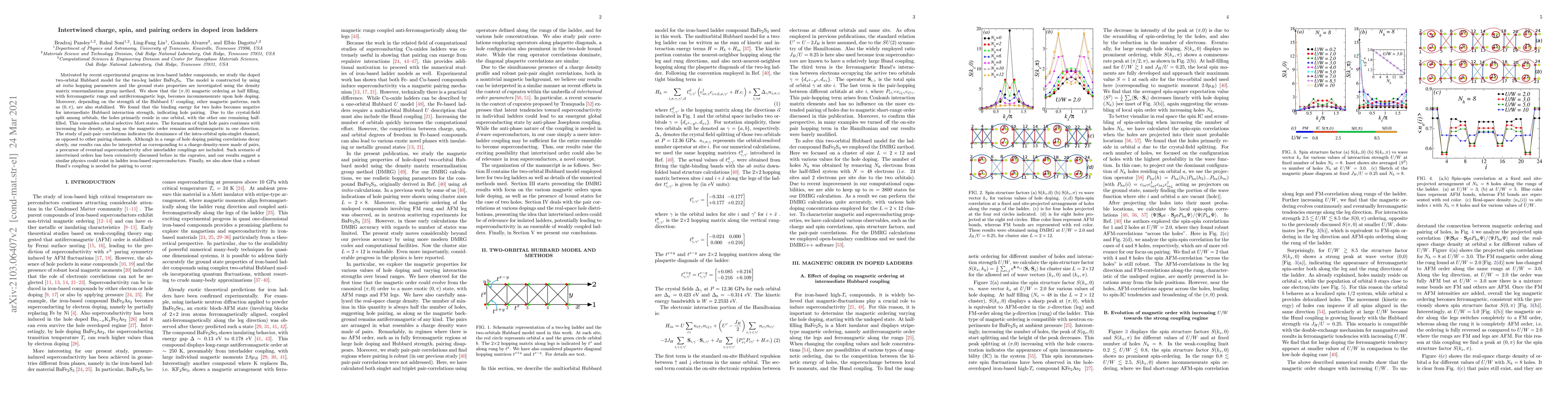 This research explores the complex interplay of charge, spin, and pairing orders in doped iron ladder compounds using a two-orbital Hubbard model. It reveals that hole doping induces incommensurate magnetic ordering and hole pairing, with a preference for intra-orbital spin-singlet pairing, suggesting a potential pathway to superconductivity akin to cuprates.