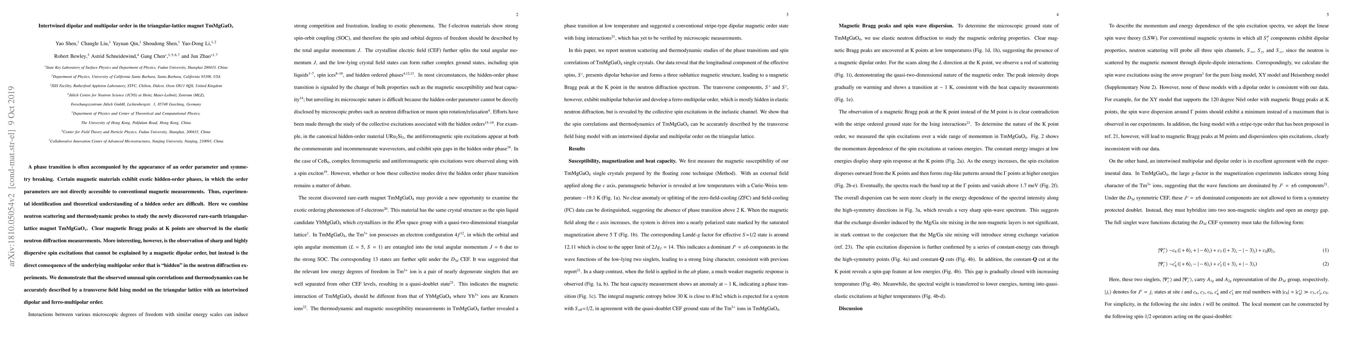 A phase transition is often accompanied by the appearance of an order parameter and symmetry breaking. Certain magnetic materials exhibit exotic hidden-order phases, in which the order parameters are not directly accessible to conventional magnetic measurements. Thus, experimental identification and theoretical understanding of a hidden order are difficult. Here we combine neutron scattering and thermodynamic probes to study the newly discovered rare-earth triangular-lattice magnet TmMgGaO$_4$. Clear magnetic Bragg peaks at K points are observed in the elastic neutron diffraction measurements. More interesting, however, is the observation of sharp and highly dispersive spin excitations that cannot be explained by a magnetic dipolar order, but instead is the direct consequence of the underlying multipolar order that is "hidden" in the neutron diffraction experiments. We demonstrate that the observed unusual spin correlations and thermodynamics can be accurately described by a transverse field Ising model on the triangular lattice with an intertwined dipolar and ferro-multipolar order.