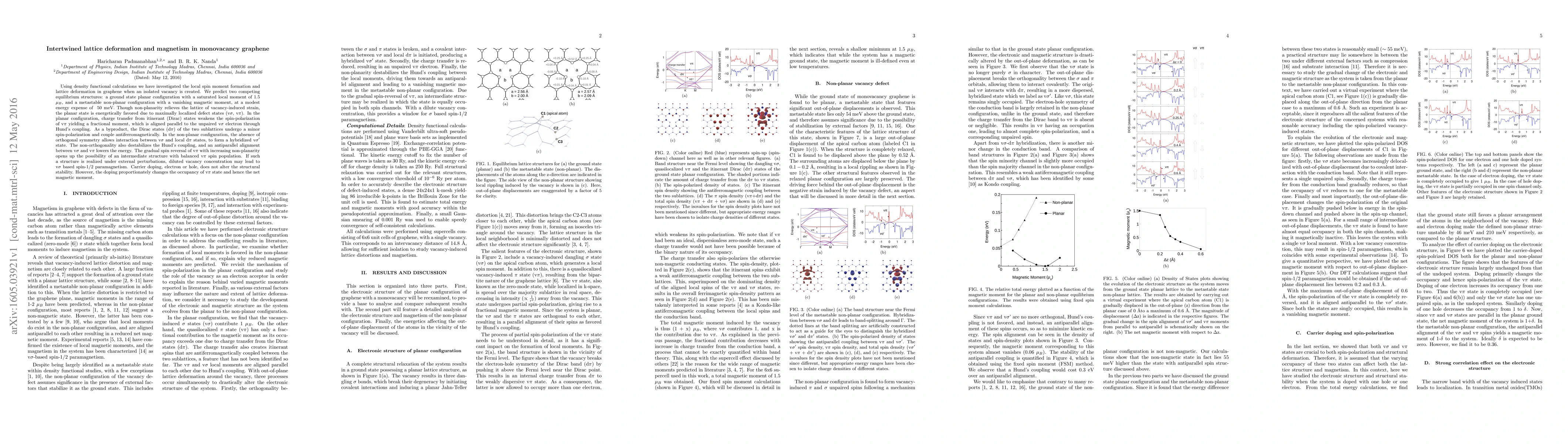 This research uses density functional calculations to explore graphene's local spin moment and lattice deformation caused by a single vacancy. It predicts two equilibrium structures: a planar configuration with a magnetic moment of 1.5 $mu_B$ and a non-planar, strain-free configuration with no magnetic moment, differing by ~50 meV. The planar state is favored due to localized defect states, while the non-planar state allows interaction between vacancy electrons and d$pi$ states, potentially enabling a spin-1/2 paramagnetism under external perturbations.