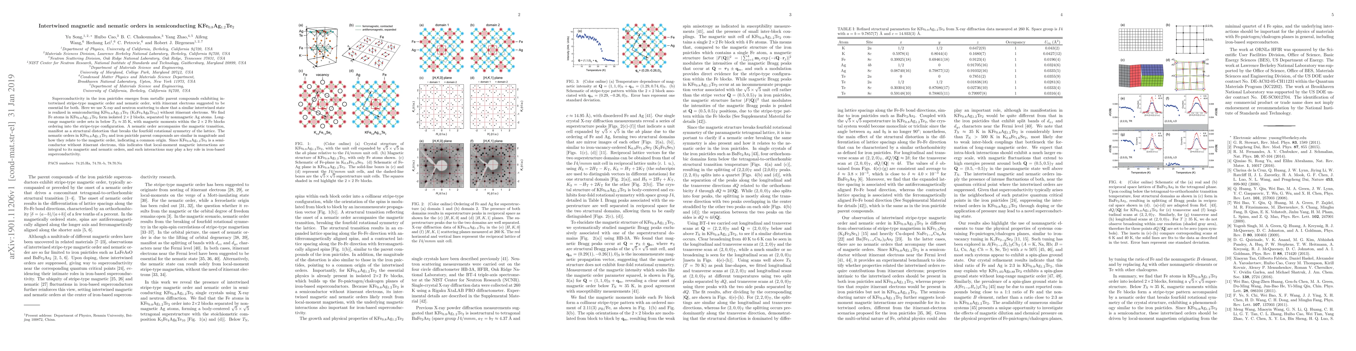 This study reveals that KFe$_{0.8}$Ag$_{1.2}$Te$_2$ exhibits intertwined magnetic and nematic orders similar to iron pnictides, despite lacking itinerant electrons. The Fe atoms form isolated $2\times2$ blocks, with magnetic moments ordering into a stripe-type configuration below 35 K, accompanied by a nematic structural distortion.