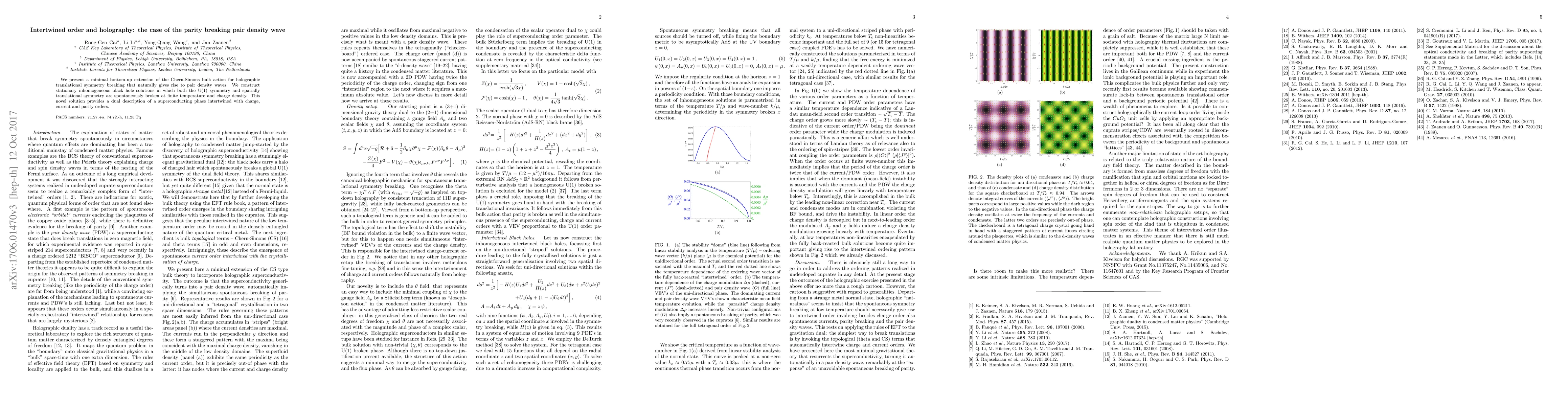 This paper introduces a new black hole solution that spontaneously breaks U(1) symmetry and translational symmetry at finite temperature and charge density, leading to a phase intertwined with superconducting order, parity breaking, and current flow.