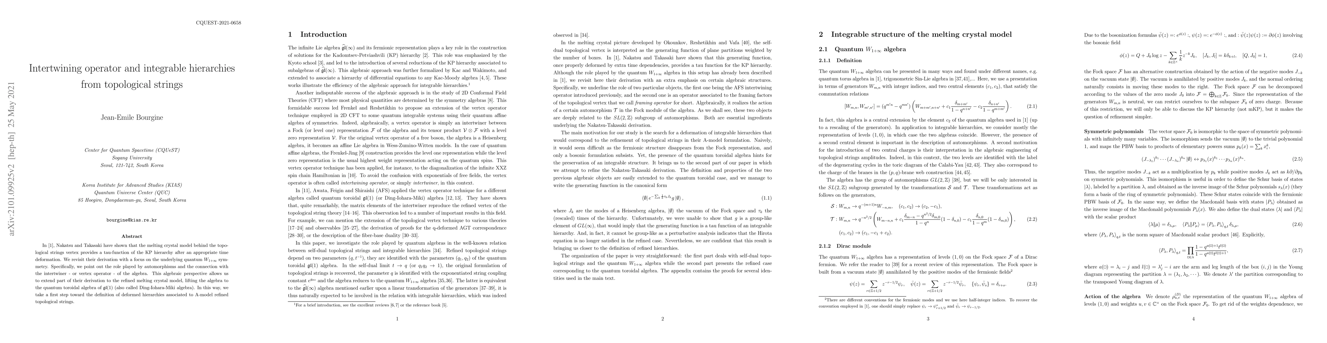 In [1], Nakatsu and Takasaki have shown that the melting crystal model behind the topological strings vertex provides a tau-function of the KP hierarchy after an appropriate time deformation. We revisit their derivation with a focus on the underlying quantum $W_{1+\infty}$ symmetry. Specifically, we point out the role played by automorphisms and the connection with the intertwiner - or vertex operator - of the algebra. This algebraic perspective allows us to extend part of their derivation to the refined melting crystal model, lifting the algebra to the quantum toroidal algebra of $\mathfrak{gl}(1)$ (also called Ding-Iohara-Miki algebra). In this way, we take a first step toward the definition of deformed hierarchies associated to A-model refined topological strings.