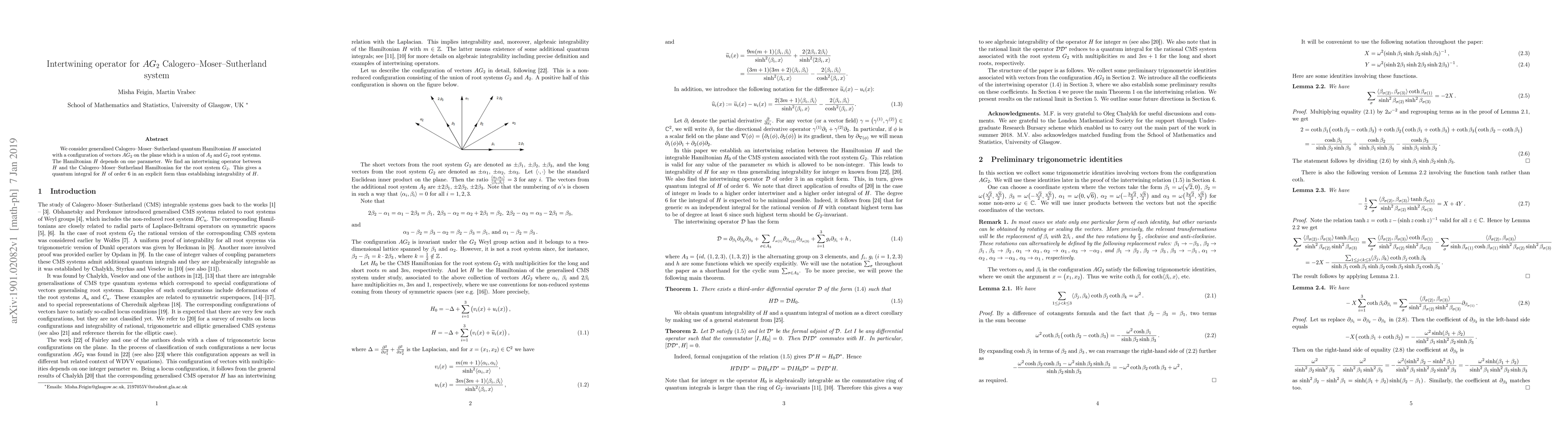 We consider generalised Calogero-Moser-Sutherland quantum Hamiltonian $H$ associated with a configuration of vectors $AG_2$ on the plane which is a union of $A_2$ and $G_2$ root systems. The Hamiltonian $H$ depends on one parameter. We find an intertwining operator between $H$ and the Calogero-Moser-Sutherland Hamiltonian for the root system $G_2$. This gives a quantum integral for $H$ of order 6 in an explicit form thus establishing integrability of $H$.