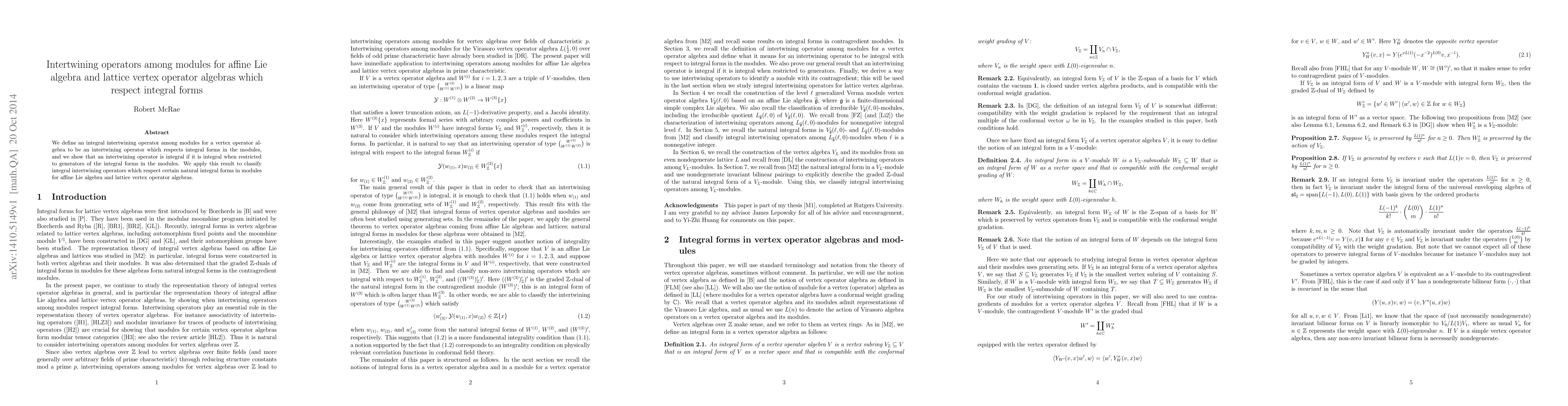 This paper defines integral intertwining operators for modules of vertex operator algebras that respect integral forms and proves that such operators remain integral when restricted to module generators. It then classifies these operators in the context of affine Lie algebra and lattice vertex operator algebras.