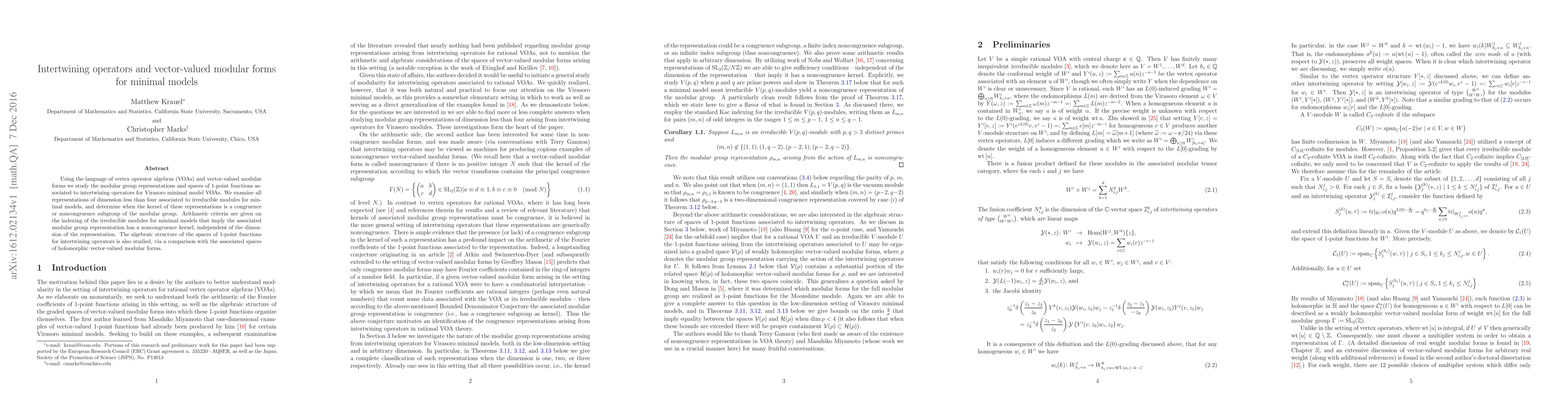 Using the language of vertex operator algebras (VOAs) and vector-valued modular forms we study the modular group representations and spaces of 1-point functions associated to intertwining operators for Virasoro minimal model VOAs. We examine all representations of dimension less than four associated to irreducible modules for minimal models, and determine when the kernel of these representations is a congruence or noncongruence subgroup of the modular group. Arithmetic criteria are given on the indexing of the irreducible modules for minimal models that imply the associated modular group representation has a noncongruence kernel, independent of the dimension of the representation. The algebraic structure of the spaces of 1-point functions for intertwining operators is also studied, via a comparison with the associated spaces of holomorphic vector-valued modular forms.