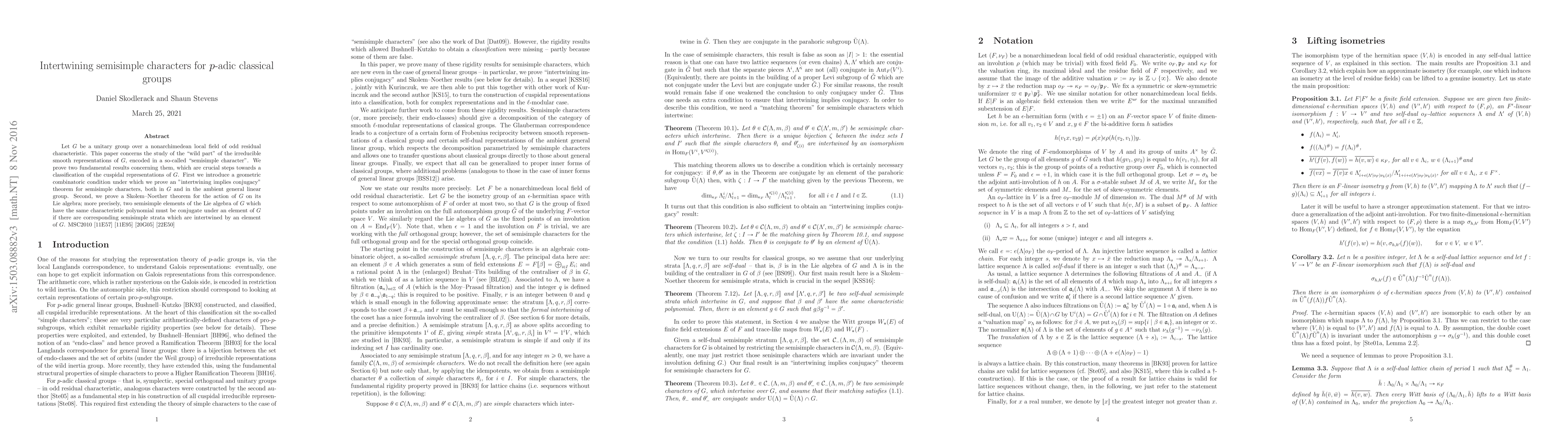 Let~$G$ be a unitary group of an~$\epsilon$-hermitian form~$h$ given over a nonarchimedean local field~$F_0$ of odd residue characteristic. We introduce a geometric combinatoric condition under which we prove "Intertwining implies Conjugacy" for semisimple characters of~$G$ and the general linear group of the ambient vector space of~$G$. Further we prove a Skolem-Noether result for the action of~$G$ on its Lie algebra, more precisely two Lie algebra elements of~$G$ which have the same characteristic polynomial over~$F$ must be conjugate under an element of~$G$ if there are corresponding semisimple characters which intertwine over an element of~$G$ } Let~$G$ be a unitary group over a nonarchimedean local field of odd residual characteristic. This paper concerns the study of the "wild part" of the irreducible smooth representations of~$G$, encoded in a so-called "semisimple character". We prove two fundamental results concerning them, which are crucial steps towards a classification of the cuspidal representations of~$G$. First we introduce a geometric combinatoric condition under which we prove an "intertwining implies conjugacy" theorem for semisimple characters, both in~$G$ and in the ambient general linear group. Second, we prove a Skolem--Noether theorem for the action of~$G$ on its Lie algebra; more precisely, two semisimple elements of the Lie algebra of~$G$ which have the same characteristic polynomial must be conjugate under an element of~$G$ if there are corresponding semisimple strata which are intertwined by an element of~$G$.