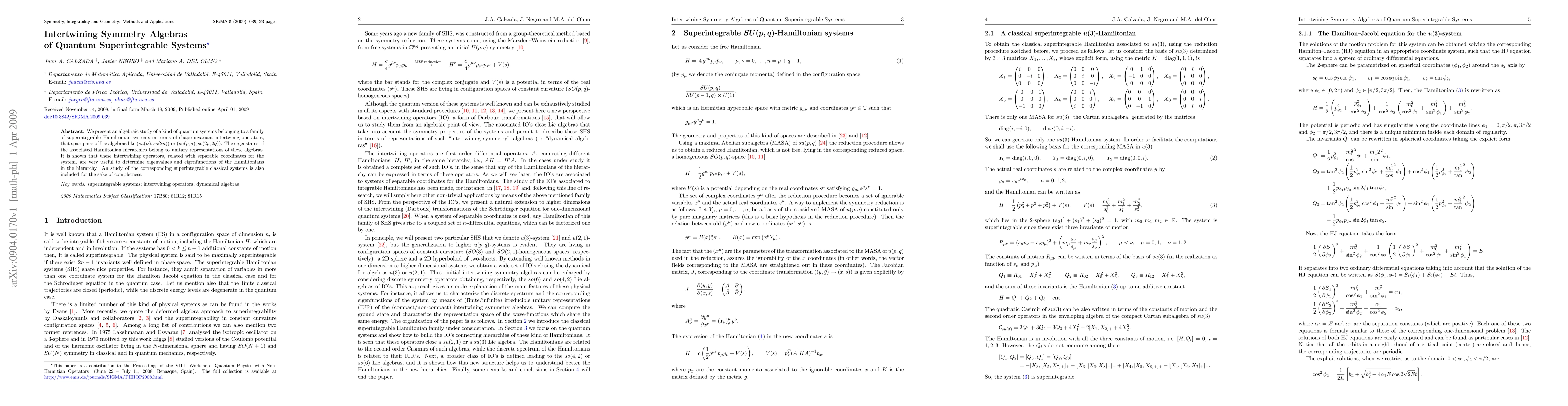 We present an algebraic study of a kind of quantum systems belonging to a family of superintegrable Hamiltonian systems in terms of shape-invariant intertwinig operators, that span pairs of Lie algebras like $(su(n),so(2n))$ or $(su(p,q),so(2p,2q))$. The eigenstates of the associated Hamiltonian hierarchies belong to unitary representations of these algebras. It is shown that these intertwining operators, related with separable coordinates for the system, are very useful to determine eigenvalues and eigenfunctions of the Hamiltonians in the hierarchy. An study of the corresponding superintegrable classical systems is also included for the sake of completness.