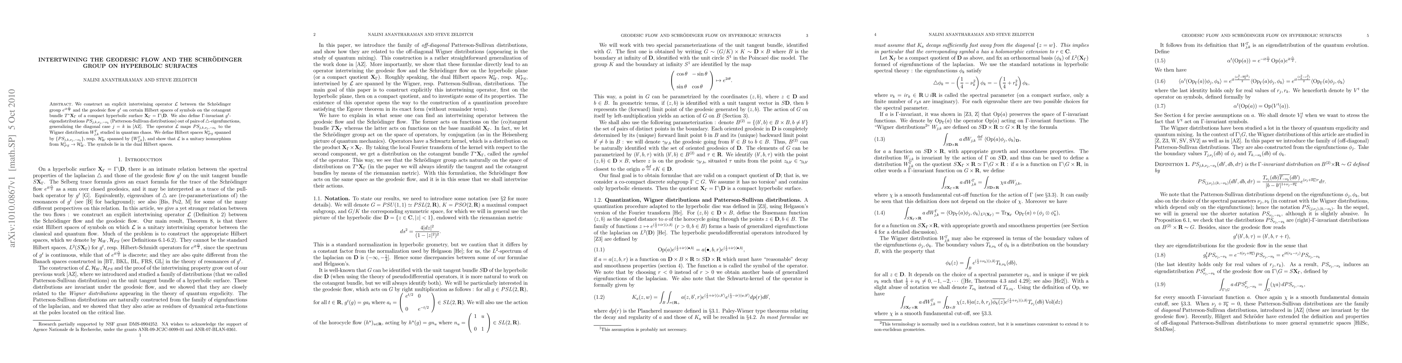 This paper constructs an intertwining operator between the Schrodinger group and geodesic flow on hyperbolic surfaces, enabling exact Egorov theorem for quantization operators.