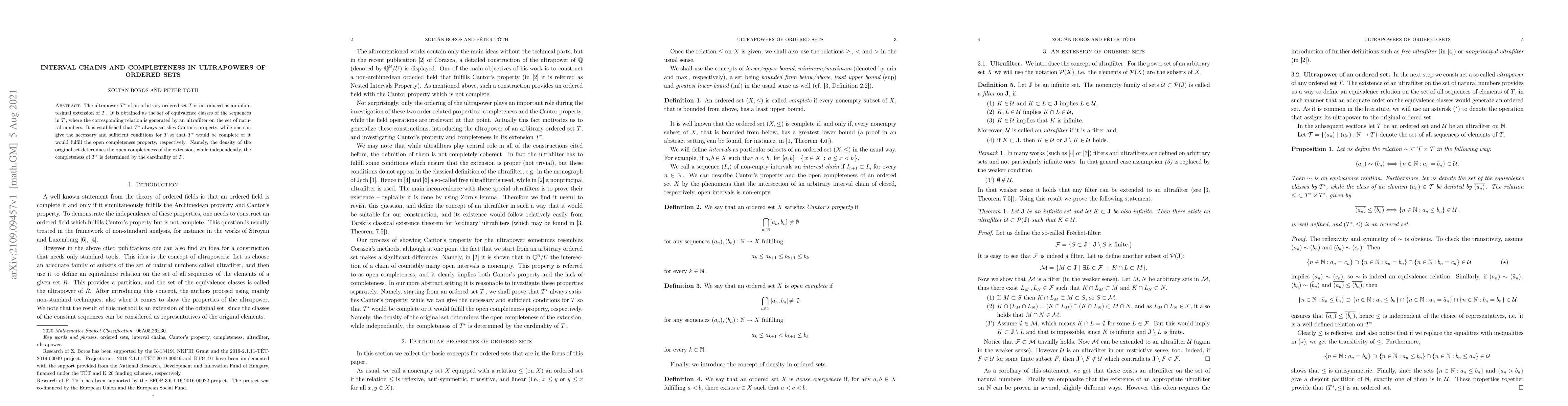 The paper introduces ultrapowers of ordered sets as infinitesimal extensions, showing they always satisfy Cantor's property. It provides conditions for completeness and open completeness of these ultrapowers, where density of the original set affects open completeness and cardinality of the original set influences completeness.