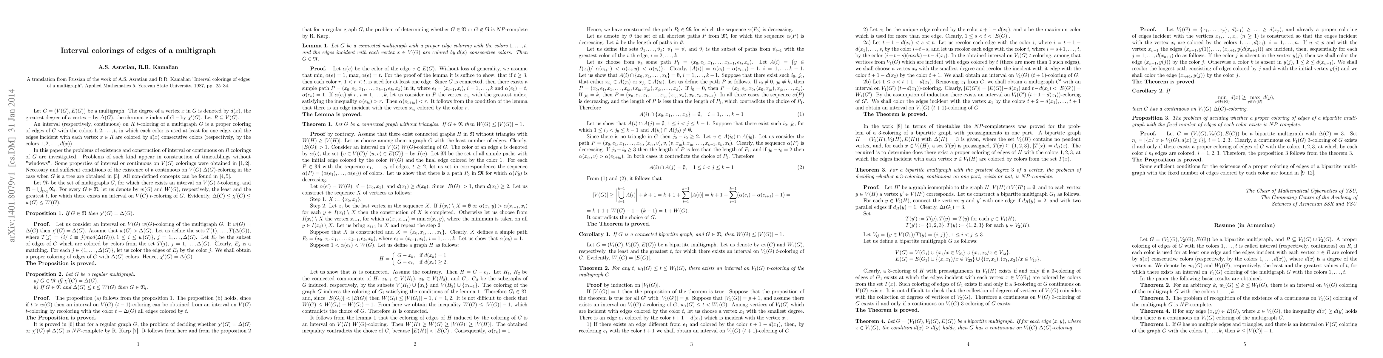 Let $G=(V_1(G),V_2(G),E(G))$ be a bipartite multigraph, and $R\subseteq V_1(G)\cup V_2(G)$. A proper coloring of edges of $G$ with the colors $1,\ldots,t$ is called interval (respectively, continuous) on $R$, if each color is used for at least one edge and the edges incident with each vertex $x\in R$ are colored by $d(x)$ consecutive colors (respectively, by the colors $1,\ldots,d(x))$, where $d(x)$ is a degree of the vertex $x$. We denote by $w_1(G)$ and $W_1(G)$, respectively, the least and the greatest values of $t$, for which there exists an interval on $V_1(G)$ coloring of the multigraph $G$ with the colors $1,\ldots,t$. In the paper the following basic results are obtained. \textbf{Theorem 2.} For an arbitrary $k$, $w_1(G)\leq k\leq W_1(G)$, there is an interval on $V_1(G)$ coloring of the multigraph $G$ with the colors $1,\ldots,k$. \textbf{Theorem 3.} The problem of recognition of the existence of a continuous on $V_1(G)$ coloring of the multigraph $G$ is $NP$-complete. \textbf{Theorem 4.} If for any edge $(x,y)\in E(G)$, where $x\in V_1(G)$, the inequality $d(x)\geq d(y)$ holds then there is a continuous on $V_1(G)$ coloring of the multigraph $G$. \textbf{Theorem 1.} If $G$ has no multiple edges and triangles, and there is an interval on $V(G)$ coloring of the graph $G$ with the colors $1,\ldots,k$, then $k\leq|V(G)|-1$.