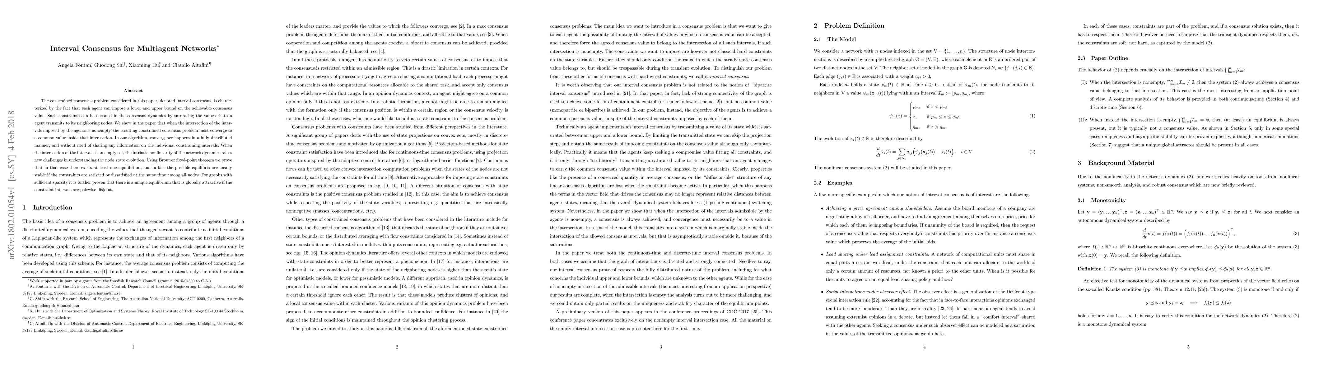 This research introduces 'interval consensus' for multiagent networks, where agents set lower and upper bounds on consensus values, achieved via saturation in transmission. Convergence to a common value within nonempty interval intersections is guaranteed. The algorithm ensures distributed convergence without interval sharing. When intersections are empty, equilibria existence and local stability are proven using Brouwer's fixed-point theorem. For sparse graphs, a unique globally attractive equilibrium is established when intervals are pairwise disjoint.