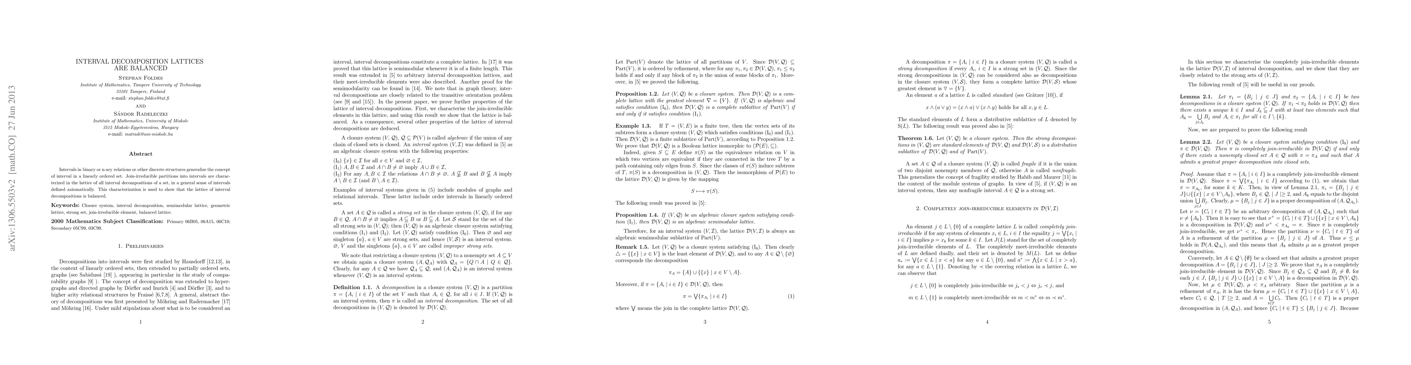 This paper characterizes join-irreducible partitions into intervals in the lattice of all interval decompositions of a set, proving that this lattice is balanced. The intervals are defined axiomatically and generalize the concept from linearly ordered sets.