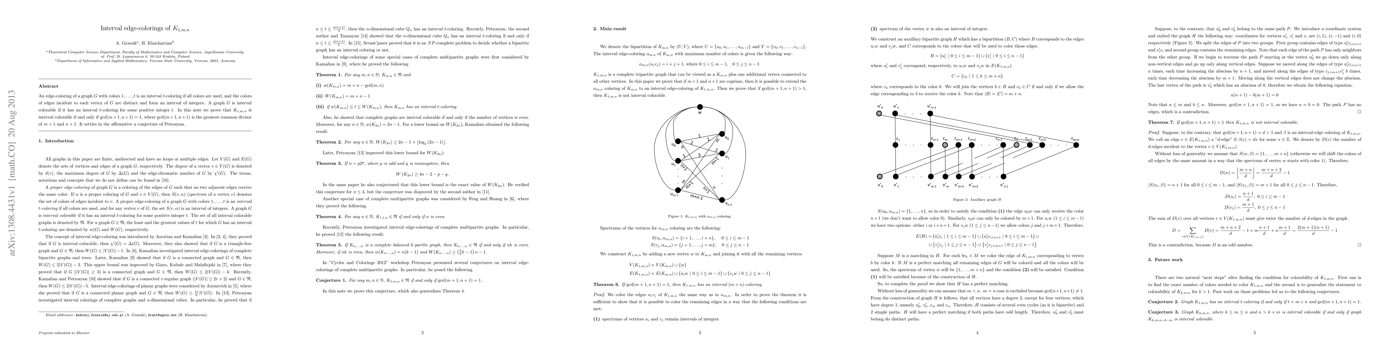 Summary: This paper proves that the complete tripartite graph K_{1,m,n} is interval edge-colorable if and only if gcd(m+1,n+1)=1, thereby confirming a conjecture by Petrosyan.